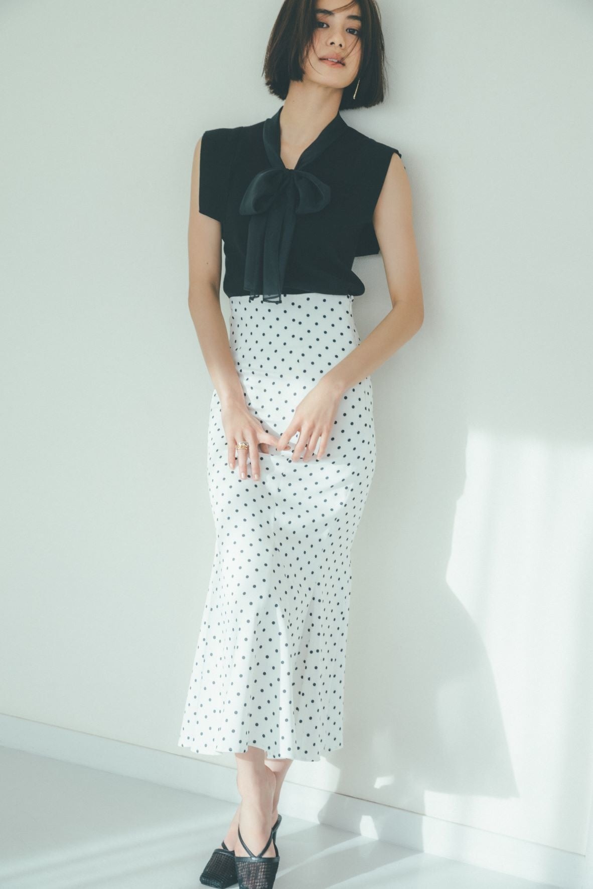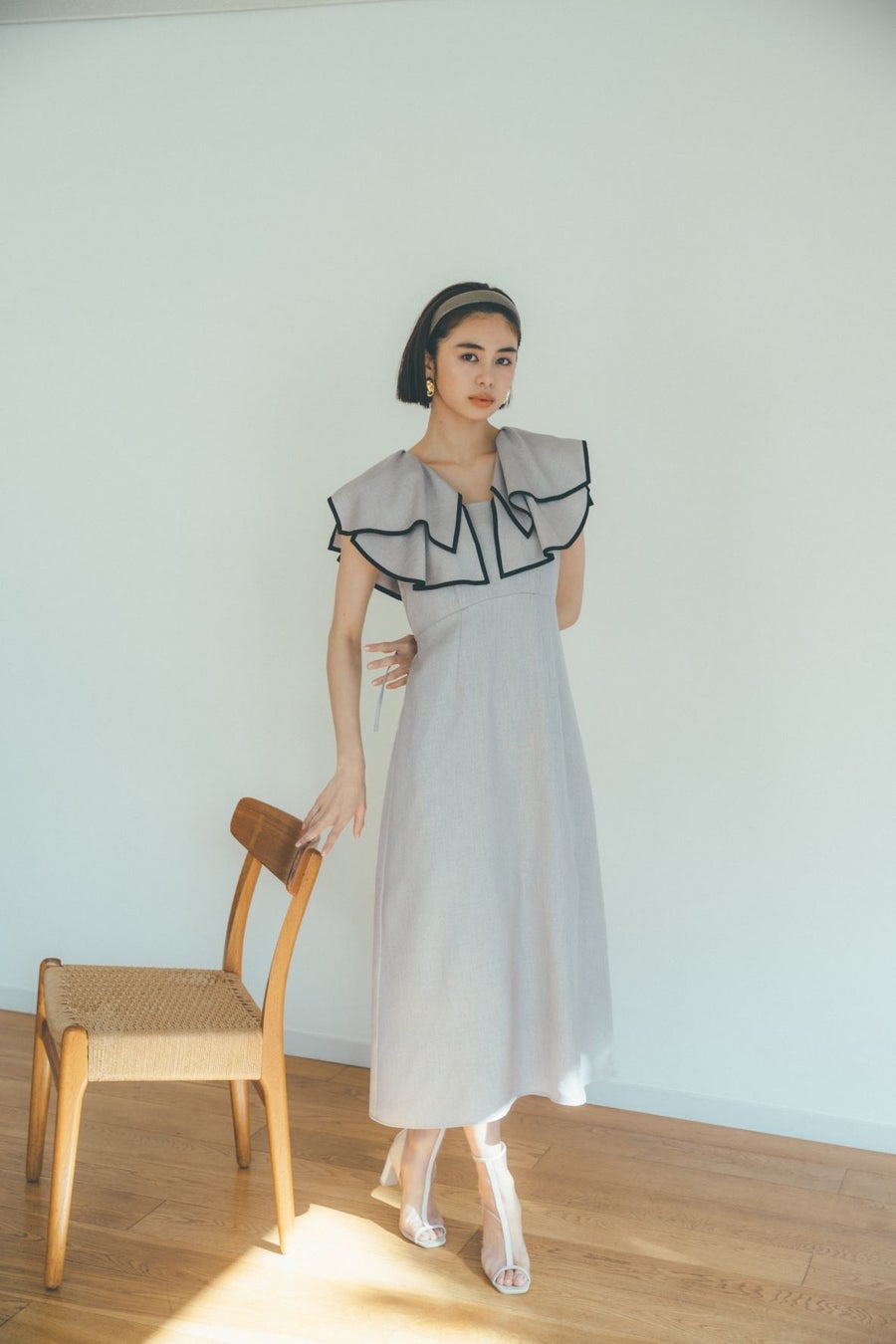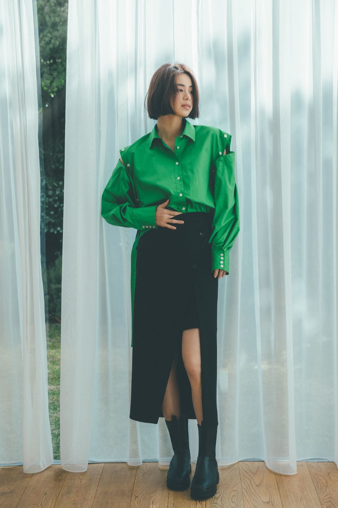 ハリ感のある構築的なパフスリーブやラインディテールはモードなエッセンスを加え、洗練された印象に。
