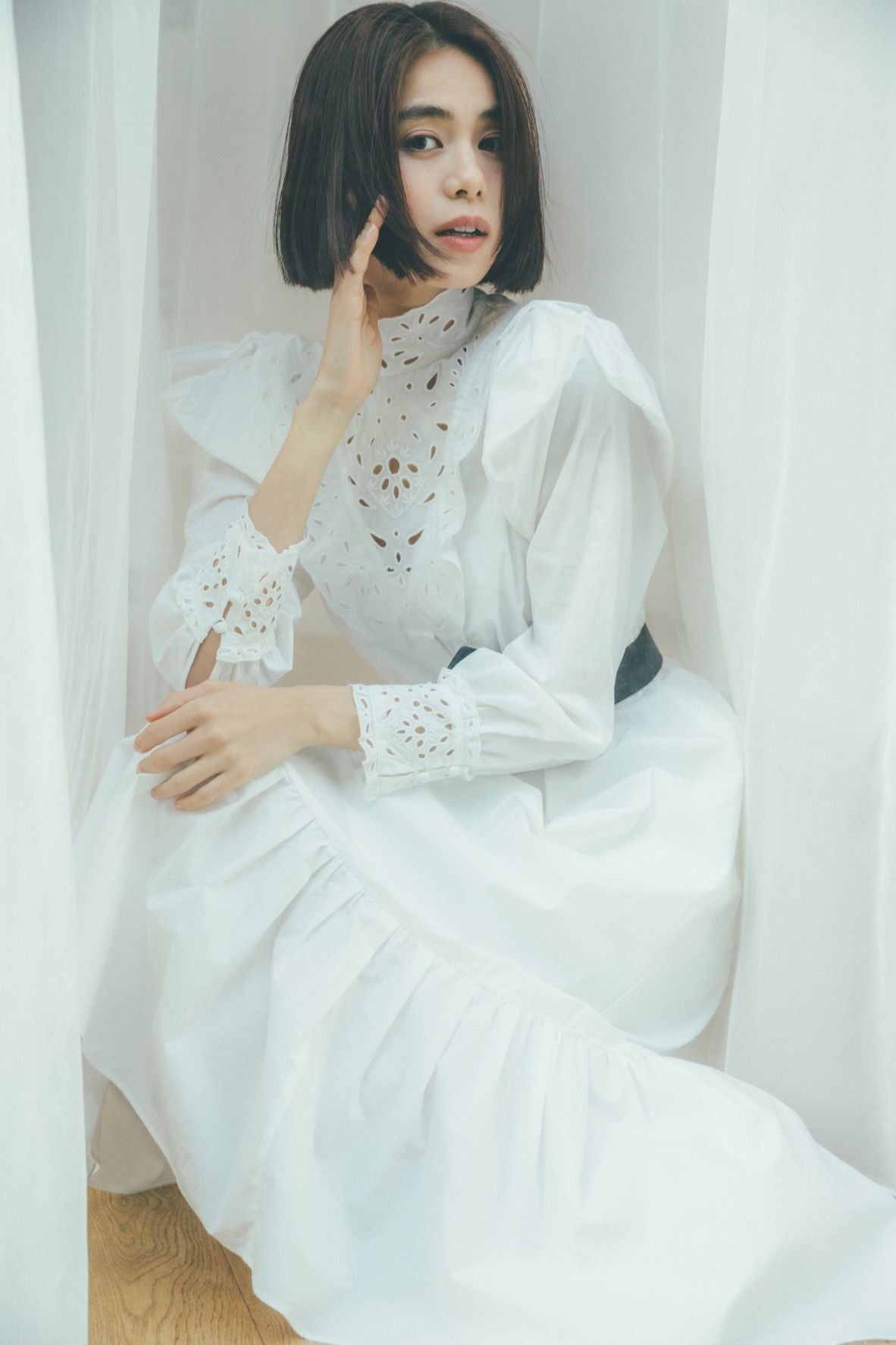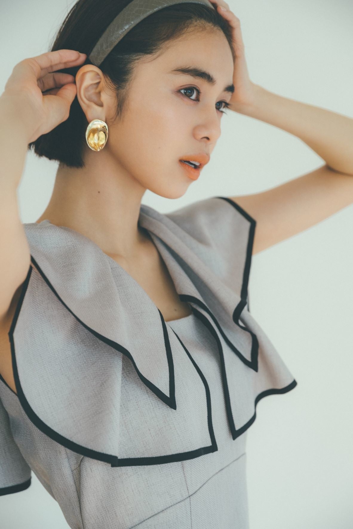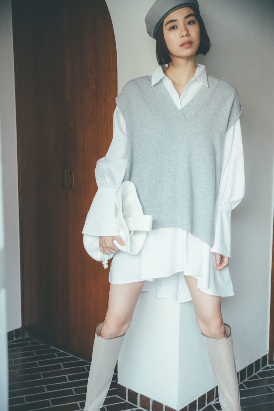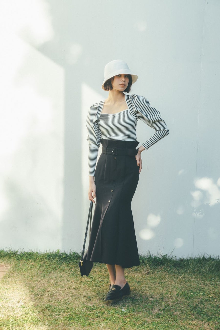 ハリ感のある構築的なパフスリーブやラインディテールはモードなエッセンスを加え、洗練された印象に。