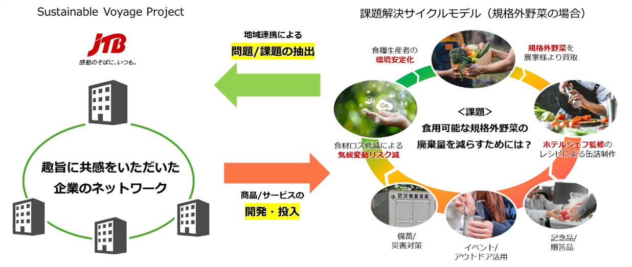 株式会社JTBは、食品ロスの低減につながる商品やサービスの開発を通じて、サステナブルな食の循環モデル(サーキュラーエコノミー)をめざす「Sustainable Voyage Project」その第3弾として、ソーシャルグッドマーケット「Kuradashi」を運営する株式会社クラダシ(以下、クラダシ)と共創を開始し、10月の食品ロス削減月間※1に「ロス旅缶」を使用したイベントを開催します。本施策では、消費者が「ロス旅缶」を試食することで寄付につながる仕組みの構築により、地域の未利用食材を活用しフードロスを削減することで、地域に貢献します。さらに、さまざまな共創パートナー企業・団体をつなげ、サステナブルな食の循環モデルの実現をめざしてまいります。