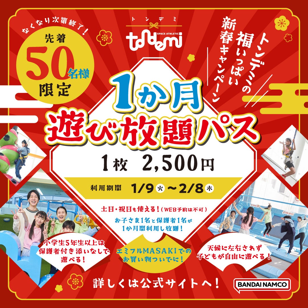 株式会社バンダイナムコアミューズメントは、屋内アスレチック施設「トンデミ愛媛」にて、2024年1月1日(月・祝)より、先着50名さま限定で「1か月遊び放題パス」を販売します。