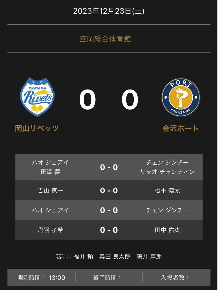 ノジマTリーグ 2023-2024シーズン 公式戦 12月23日開催 岡山リベッツ vs 金沢ポート オーダー発表