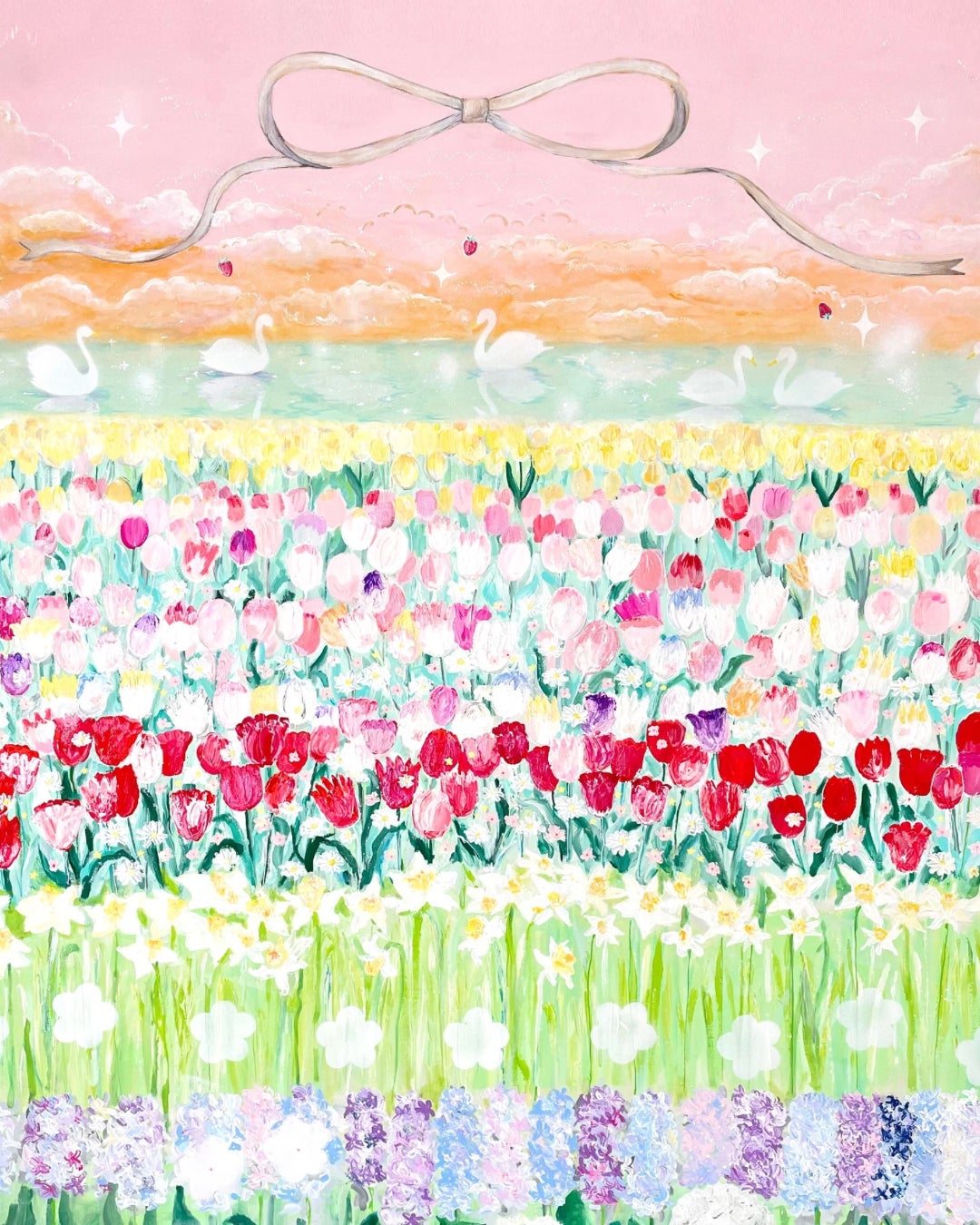 新宿高島屋では、「夢中になることで心が軽やかに宙へと舞い上がり、流れるように広がっていく感覚」をテーマとした、人気アーティストの東ちなつさんの個展を開催いたします。リボンや花、光や感情のゆらぎをモチーフに、「時を超えるフェミニティ」として、大人の女性の少女性を肯定し、祝福する世界を描きます。