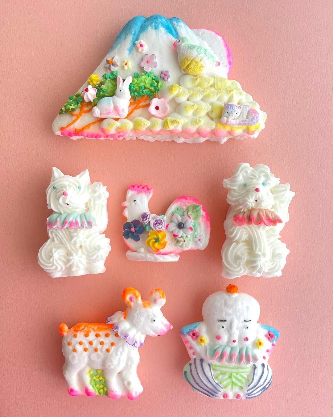 アパレルブランドとのコラボレーション、プロダクトデザイン、広告などを中心に活躍している、注目のアーティスト。2015年より故郷金沢の伝統菓子『金花糖』をベースに新しい解釈で絵付けとデコレーションを施した砂糖の立体作品を展開。コロナ禍の時期に制作を開始したアートトーストはSNSで話題となり、カフェイベントや海外ファッションブランドとのコラボ展開等、フェミニンな創作スタイルが注目を集めているほか、書籍の装画も手掛けるなど幅広いジャンルで精力的に活躍している。