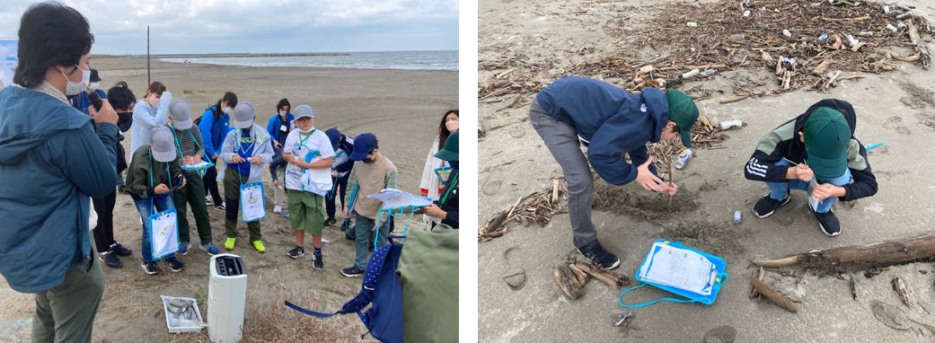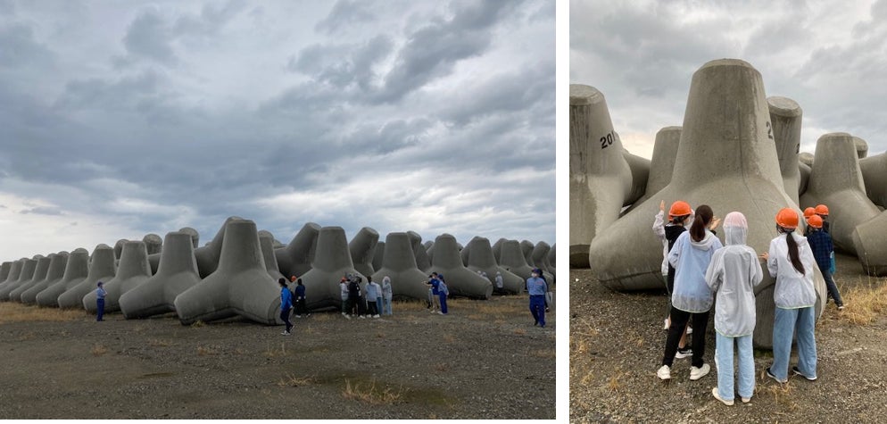 午後の講座は、国土交通省北陸地方整備局新潟港湾・空港整備事務所の清水利浩(としひろ)さんを講師に砂浜の環境の現状と保全の取り組みを学びました。波の大きな力を減衰するため海中にも見えないブロックが設置され、砂浜から海に飛び出す5本の突堤(とってい)と共に砂の流出を防いでいることの説明を受けた後、実際の消波ブロックに近くで触れる体験ができました。清水さんによると波の力はとても強く、この高さ4メートル、重さ40トンのブロックも動かします。もちろんグループで押してもびくともしません!