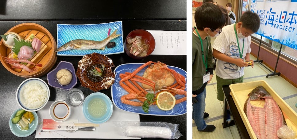 2日目の昼食は「美味探求の宿 住吉屋(すみよしや)」。海の幸を通じて海に親しむことも今回のイベントの重要な目的です。この鮮魚店が並ぶ「寺泊魚の市場通り」は通称「魚のアメ横」で知られる観光スポットでもあり、新鮮さはお墨付き。カニを前に口数が少なくなる場面もありましたが、100人前の刺身が取れるという巨大ヒラメやカマスの浜焼きに大興奮、アプリを使ってサイズを測ったり刺身の魚種を確認しあったりとあっという間に時間が過ぎます。2日目ともなると他のチームとも仲良くなりにぎやかさも増してきました。