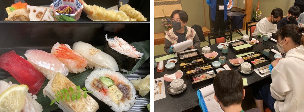常務取締役の横山毅(たけし)さんによると、マグロ以外のネタは全て新潟産。先ほどプライドフィッシュとして説明された南蛮エビやノドグロも目の前に並びました。新潟らしくカキノモト(食用菊の花びらのおひたし)や村上市・笹川流れ(ささがわながれ)特産の塩を添えた天ぷら、また若狭焼の調理方法にも関心した様子でした。もったいないからと好きなネタを最後まで食べないなど子どもらしさがかいま見られる一方、一口食べるごとに食レポを書き込む玄人はだしの参加者もいました。