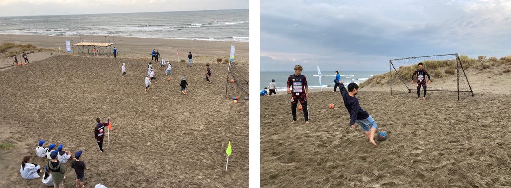 続いては、ビーチサッカーを体験。日本ビーチサッカー連盟新潟県支部の協力で、ビーチサッカー日本代表の藤本凌久(りく)選手が登場。華麗なオーバーヘッドキックで参加者の心を鷲づかみにするとリフティングを駆使したドリブルも披露、手ほどきの後はいよいよ小学生チームと対戦です。砂の上で足を取られないようチョコチョコ走りを伝授され、小学生チームも好プレーを連発しました。砂浜とは切っても切れない関係のビーチサッカーなので、競技の前にはビーチクリーンを欠かさず、さらに耕運機を改良した機械で砂浜を耕すことも行うそうです。選手の魅力に惹かれて海岸清掃を始めたい!と声を上げる女子もいました。こうした体験を通じて海や砂浜に目を向けるのもきっかけのひとつだと思います。