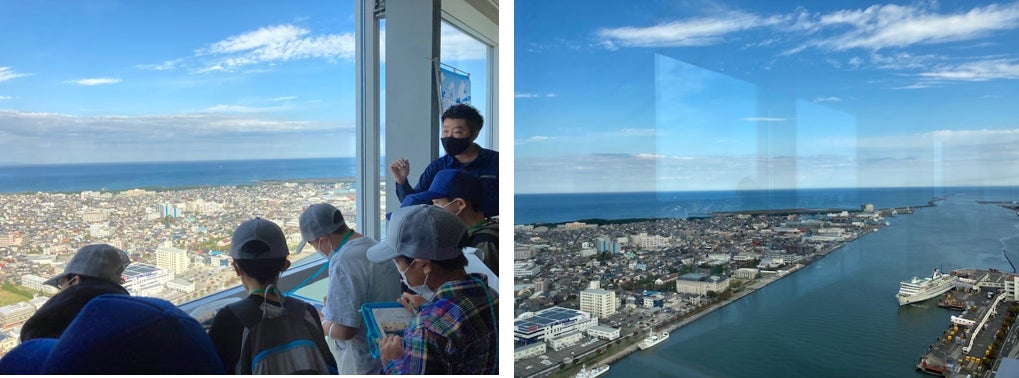 地上125メートル、新潟市内で最も高い31階の展望室から新潟の街を俯瞰し、街と海の意外な近さや消波ブロックの存在、砂浜の位置を確認。眼下を流れる信濃川が日本海に注ぎ込む様子を見ながらNPO法人新潟海洋開発の本間海渡代表理事の話に耳を傾けました。新潟県を日本一の米どころに押し上げた「越後平野」の成り立ちや、開港5港のひとつとして湊町新潟が栄えてきた歴史にも触れ、古くから海と川の恩恵を受けてきたことに参加者それぞれが思いをはせていました。