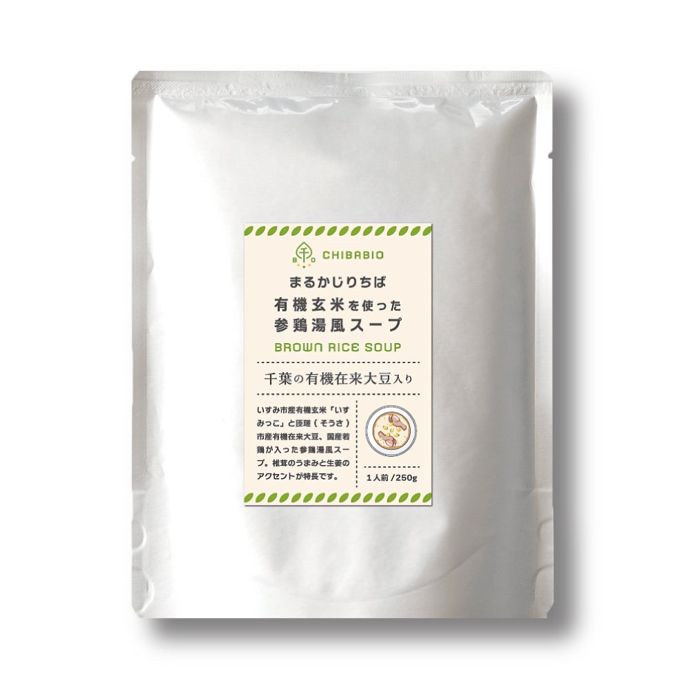 千葉県いすみ市有機玄米「いすみっこ」と千葉県匝瑳市産有機在来大豆、国産若鶏が入った参鶏湯風スープ。椎茸のうまみと生姜のアクセントが特長です。■販売開始日・主な販売店舗