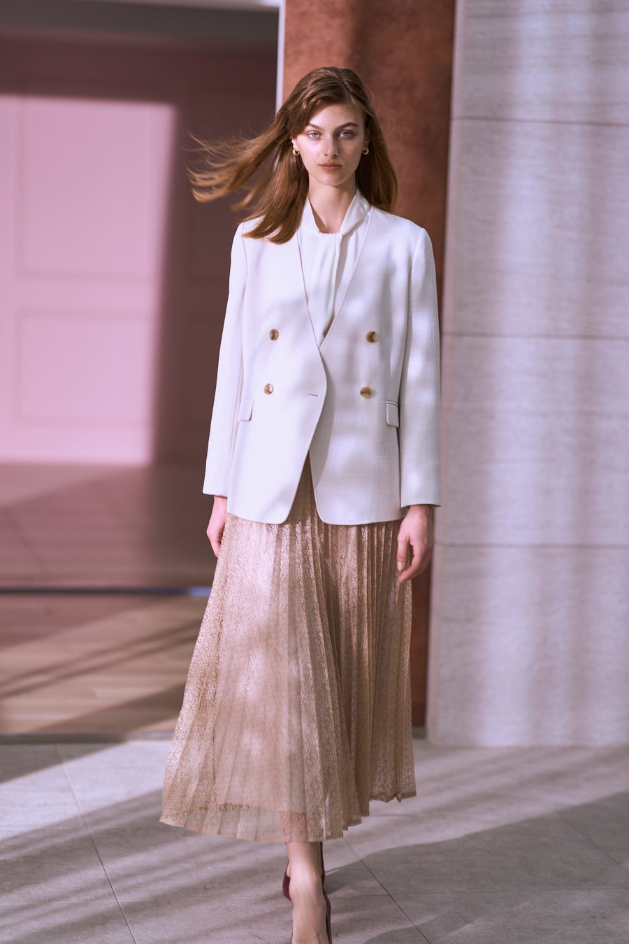 秋冬第二弾となるヴィジュアルLOOKでは、意匠感のあるツィード素材のブルゾンとタイトスカートのセットアップ、幾何学柄のレースプリーツスカートやツィード調の女性らしいジャンパースカートなどが登場。