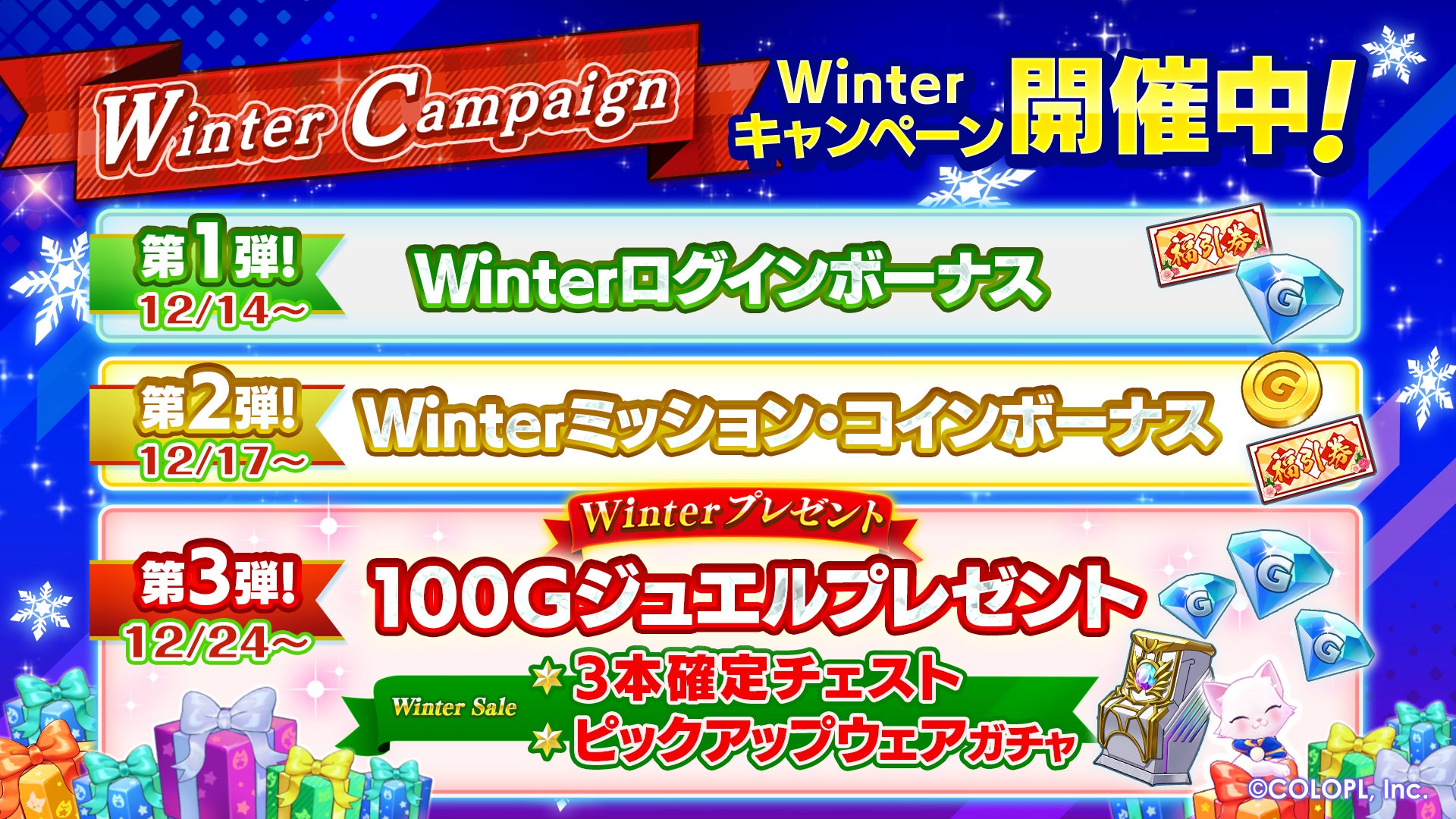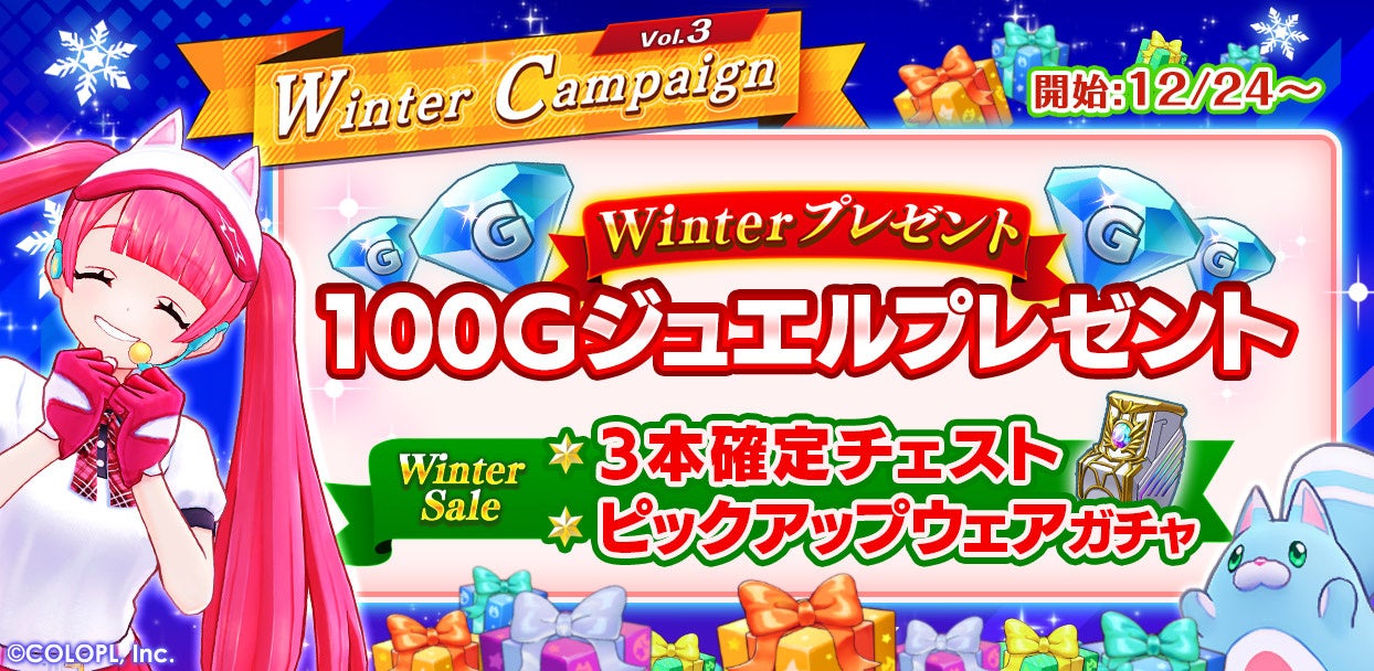 期間限定で「Winterギフト」をプレゼント中です。期間中にログインすると「Gジュエル」100個が貰えます。ぜひこの機会にお受け取りください。