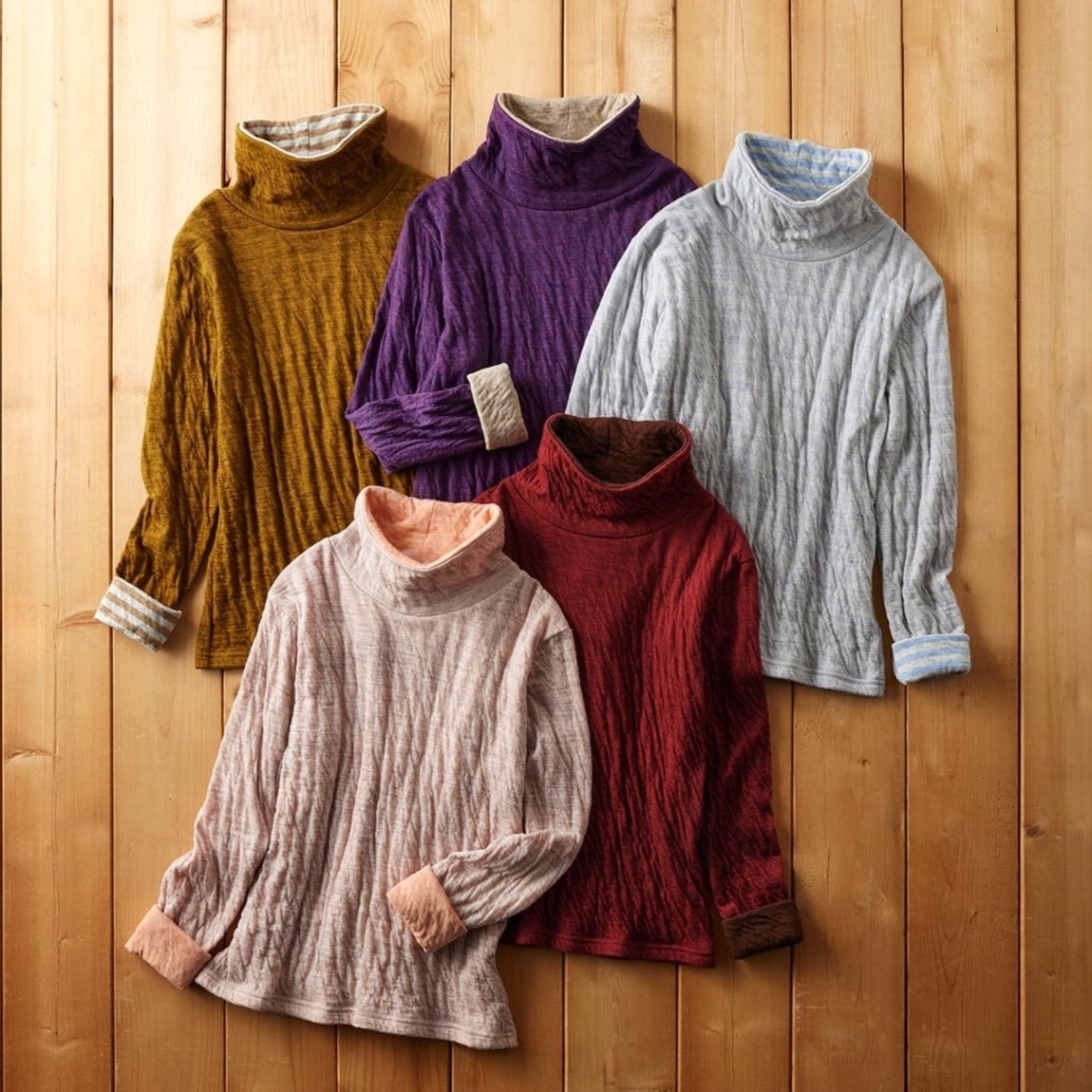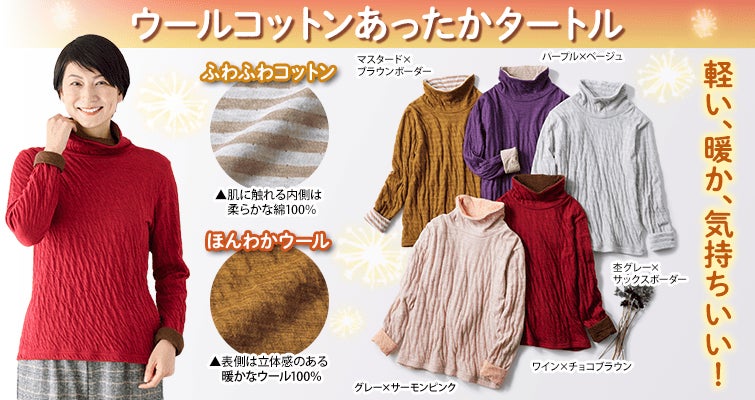 『ウールコットンあったかタートル』は、表側には軽くて暖かいウール100%、肌側にはやわらかなコットン100%の生地を贅沢に使用したタートルネックです。