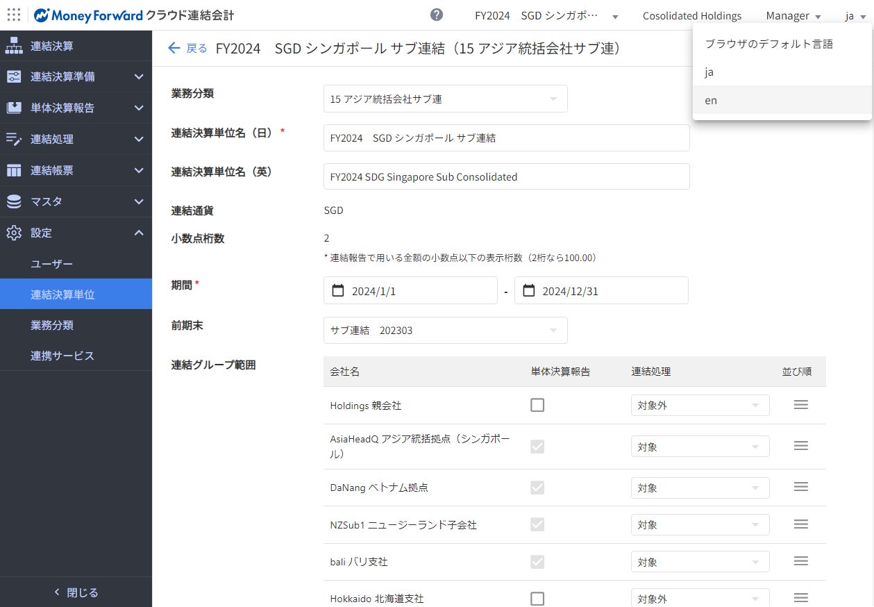 これまで、『マネーフォワード クラウド連結会計』において、海外子会社の英語話者が自ら個別財務諸表データを入力できるよう、英語表示対応を行っていました。この度、これまで提供してきた英語表示対応の拡張に加え、連結決算に用いる連結通貨の切り替えができる「連結通貨」切替機能および、USDやEURでの連結決算に必要な「小数点桁数」の切替機能を提供することで、グローバル対応を完了しました。