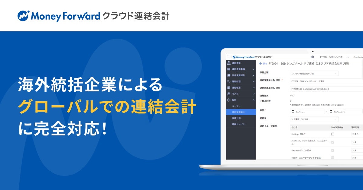 株式会社マネーフォワードは、『マネーフォワード クラウド連結会計』において、連結決算の「連結通貨」の切替および、米ドルやユーロでの連結決算に必要な「小数点桁数」の切替に対応しました。これにより、国内での連結業務のみならず、海外統括会社における連結決算業務を同一のシステム上で実現するとともに、全画面の表示を英語化し、グローバルでの連結会計に完全対応しました。