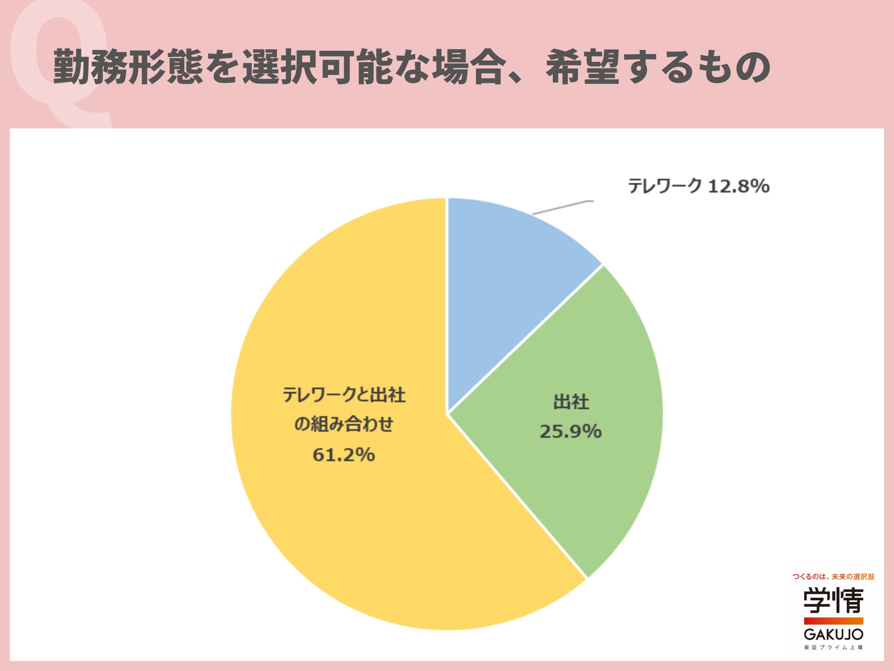 希望する勤務形態は「テレワークと出社の組み合わせ」が61.2%で最多。「仕事内容に応じて、勤務形態を選択したい」の声