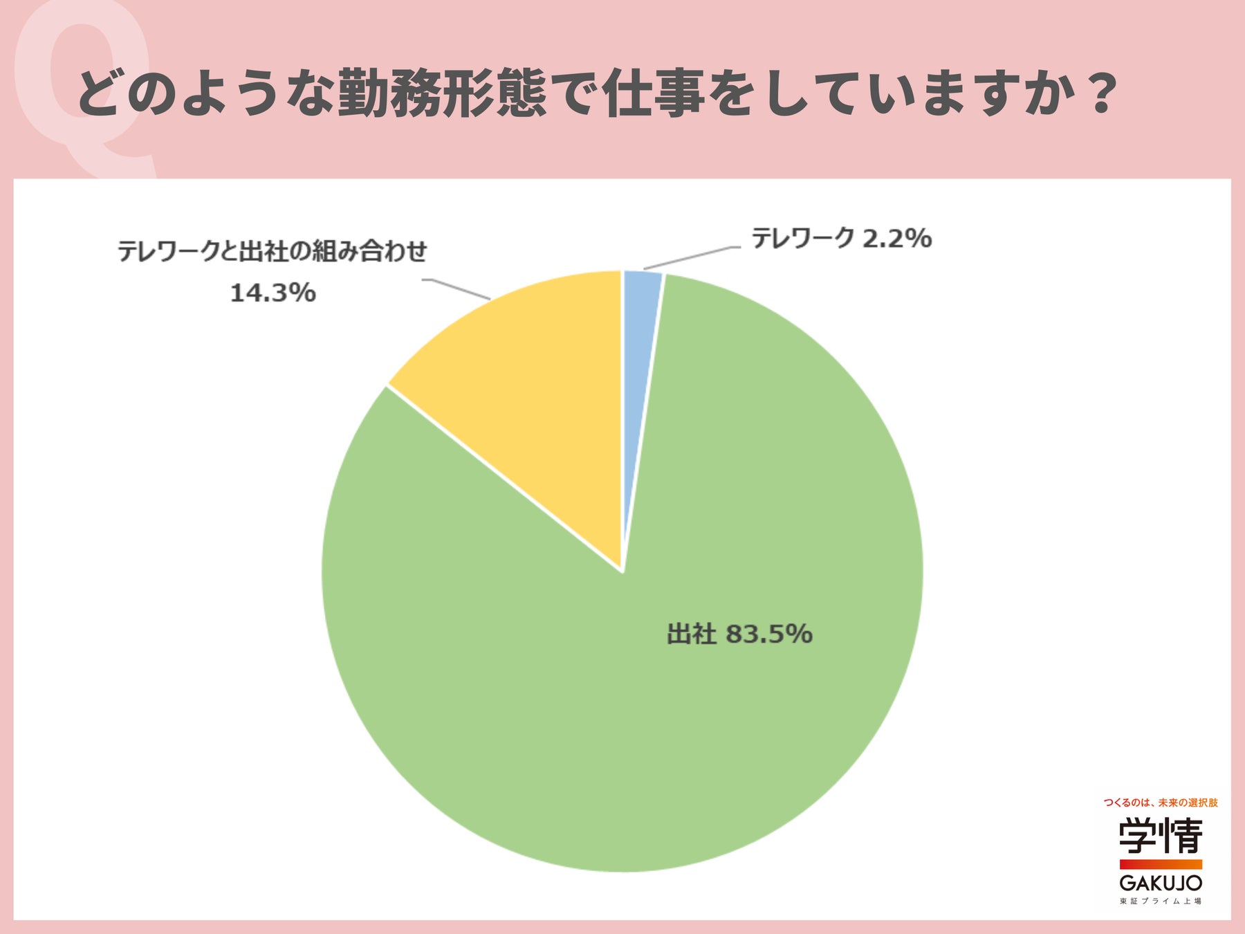 株式会社学情(本社:東京都中央区)は、20代の仕事観や働く意識をひも解くために、アンケート調査を実施しました。今回は、「勤務形態」について調査。現在の勤務形態は、「出社」が83.5%で最多となりました。一方、希望する勤務形態は、「テレワークと出社の組み合わせ」が61.2%で最多。次いで、「出社」が25.9%で続きます。「仕事内容に応じて、勤務形態を選択したい」「テレワークだけだと、先輩や上司に質問をするタイミングがわかりづらい」「天候が悪いときや体調が優れないときにテレワークを活用し、自宅で無理のない範囲で働きたい」といった声が寄せられています。