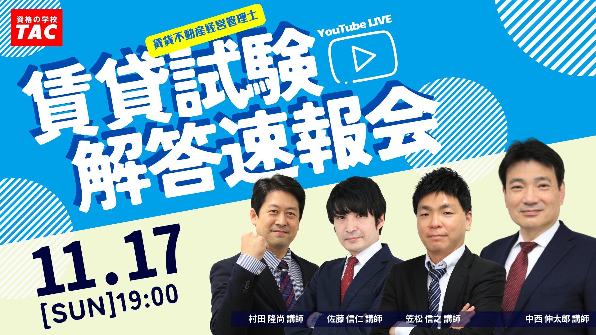 賃貸不動産経営管理士対策講座を展開しているTAC株式会社(東京都千代田区、代表取締役:多田敏男)は11/17(日)に実施される『令和6年度 賃貸不動産経営管理士試験』の解答速報を試験当日にTACのWebサイトで公開いたします。さらに、「難易度」「各分野の所感」などをお伝えする『本試験速報会』を同日に開催、その模様をYouTubeにてLIVE配信いたします。ぜひご覧ください!