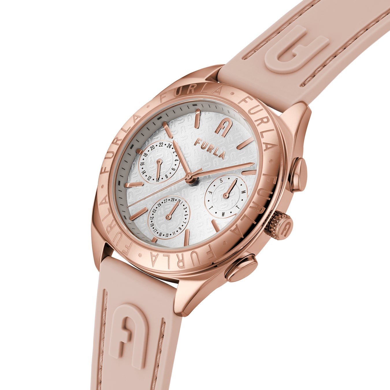 『FURLA LOGOS (フルラ ロゴス)』は、フルラらしい大人のエレガンスはそのままに、気取らず、心地よく着用できるスポーティーな腕時計コレクションです。カジュアルなスウェットやスニーカーにはもちろん、レディなスカートに合わせてお出かけ仕様のスタイリングにもこなれ感をプラスしてくれます。