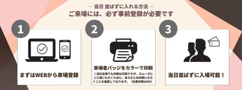 ご来場には、必ず事前来場登録が必要です。従来、会場にお越しいただいてから来場バッジを発行しておりましたが、今回より会場で受付をせず、そのままご入場できるようにいたしました。スムーズにご入場いただくためにも、あらかじめバッジを印刷していただく事を推奨しております。