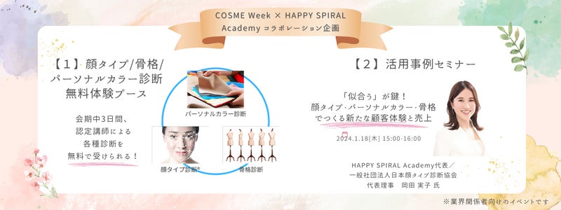 また、顔タイプ診断®をはじめとする各種診断の概念を事業に取り入れて、売上や付加価値向上を目指したい方向けに、HAPPY SPIRAL Academy 代表/(一社)日本顔タイプ診断協会 代表理事 岡田実子氏による活用事例セミナーも開催いたします。
