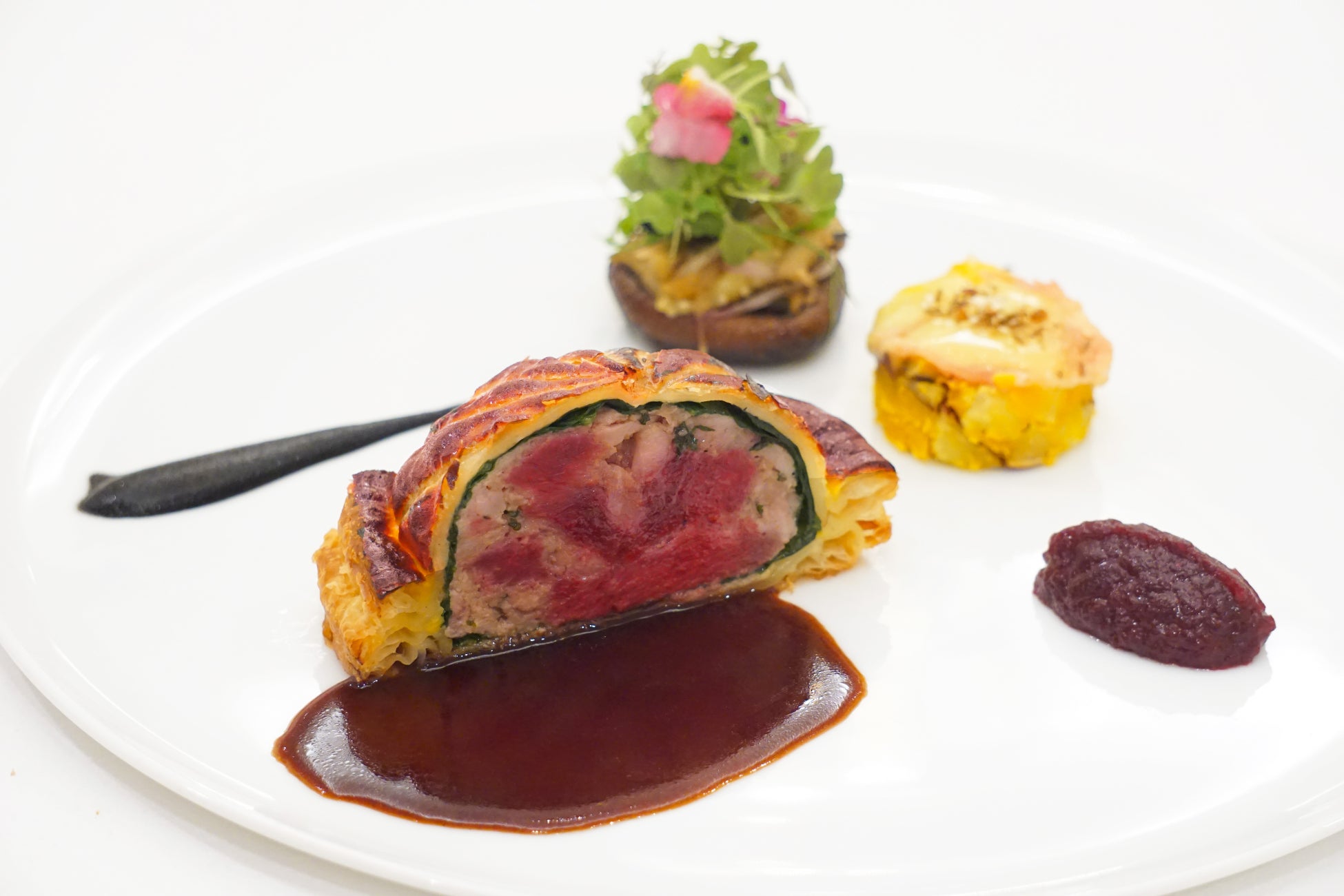 ローストしてからキャラメリゼした胸肉と、塩麹とポートワインでマリネした腿肉のパテを黒トリュフの贅沢なソースで。