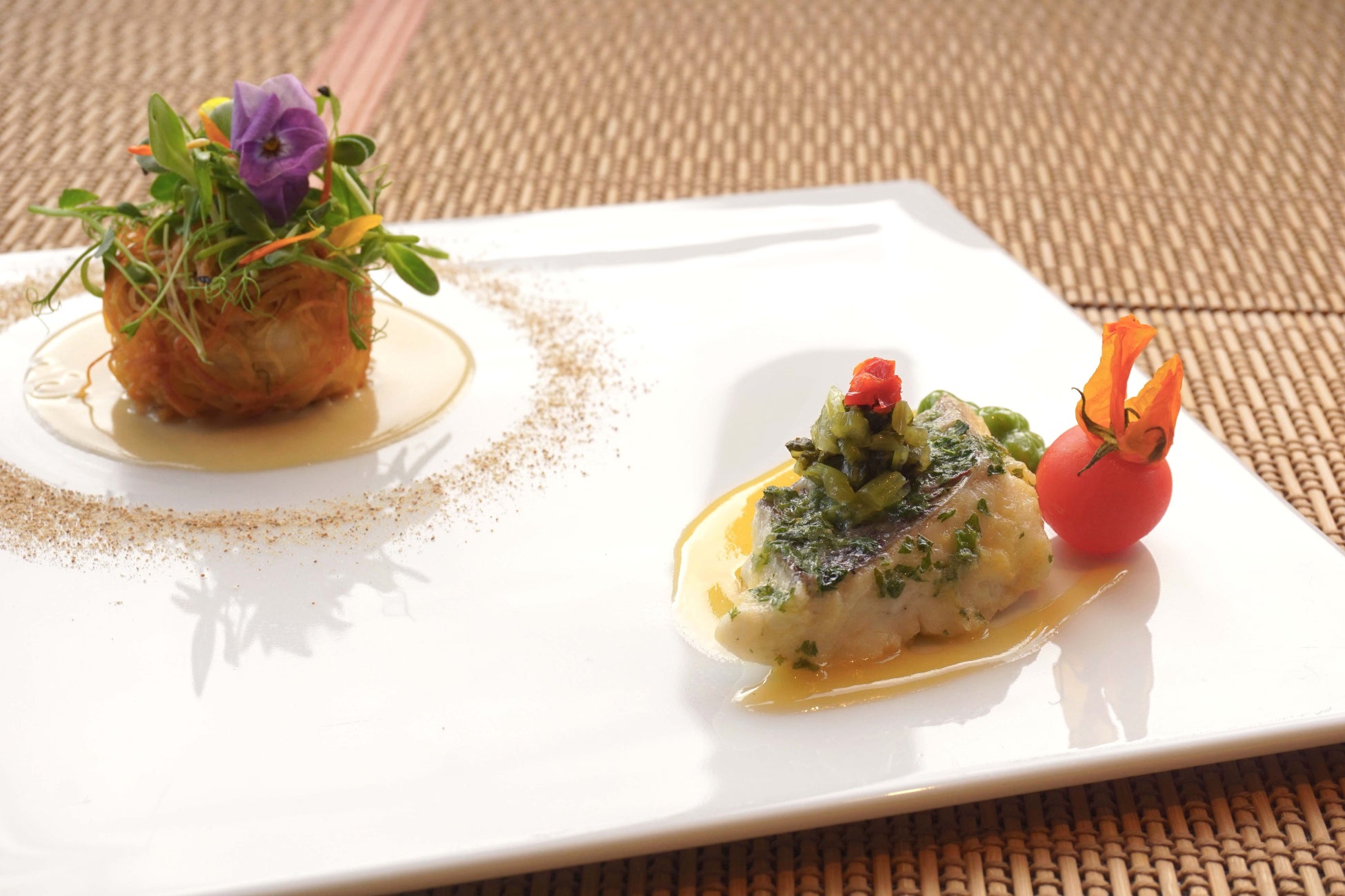 中国料理は真鯛を紹興酒と香草で香りづけし、西洋料理のフュメドポワソンと中国料理の上湯、それぞれの出汁をブレンドした煮汁でふっくらと煮詰めて。四川山椒と四川唐辛子のピーナッツ油のソースには芭蕉菜漬けやセロリを加え、辛味の中に酸味と食感がアクセントのソースで。