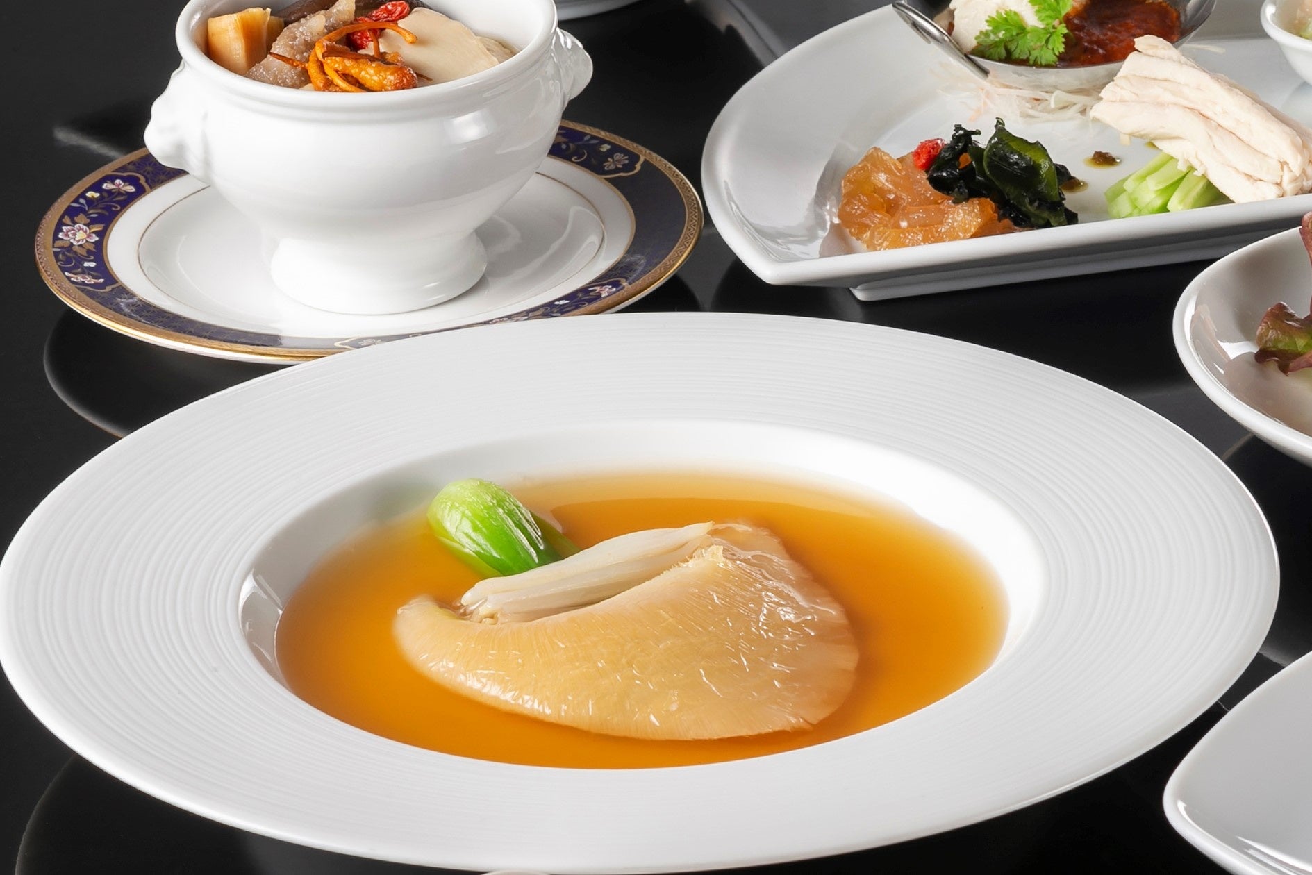 今回は北東北の生産者の方々が大切に育てた食材に敬意を払い、中国料理の持つ力強さとフランス料理の繊細さ、両方を表現できるメニューを考案しました。コース料理のはじまりは、胃をあたため、食事をより美味しくお召し上がりいただきたいという食養薬膳の考え方を表現した蒸しスープをご用意します。今回のスープには、鶏肉の持つコクや香りが特長の比内地鶏を使用。薬膳食材など20種類以上の素材と合わせ、ゆっくりと時間をかけて蒸すことで、にごりや雑味のない透き通ったスープに仕上がります。
