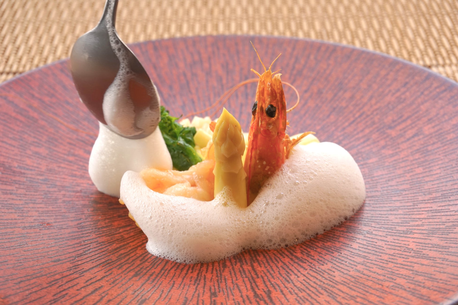 ホワイトアスパラガスと天使の海老の甘みを引き出したシンプルな塩炒めに、フランス料理の技法で作る泡のソースを添えて。徐々に溶け出す泡のソースで変わる味わいを堪能。