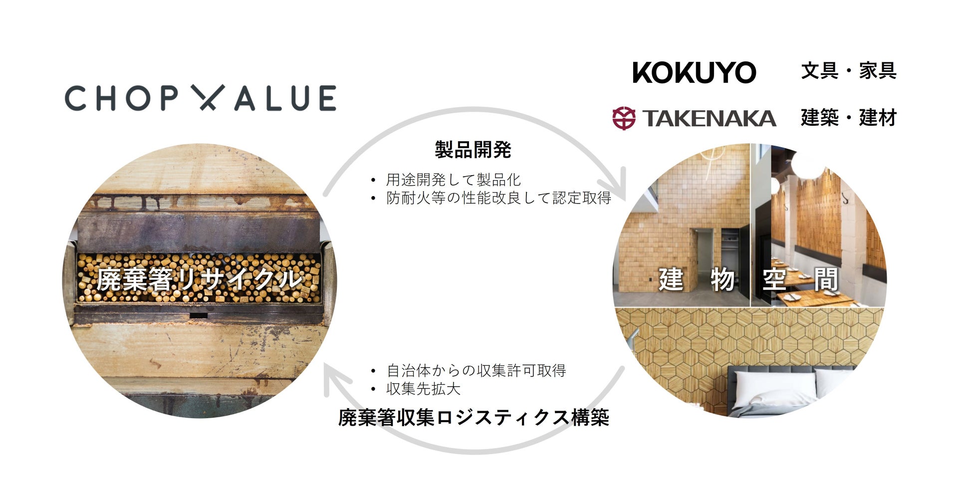 コクヨ、竹中工務店のそれぞれの事業所の割り箸の回収に関する実証試験を行い、日本における適切な回収体制・ロジスティクスの構築を目指します。ChopValue Japanの技術を活用し、コクヨは家具・什器の、竹中工務店は建材の新用途・新製品の開発を進めます。