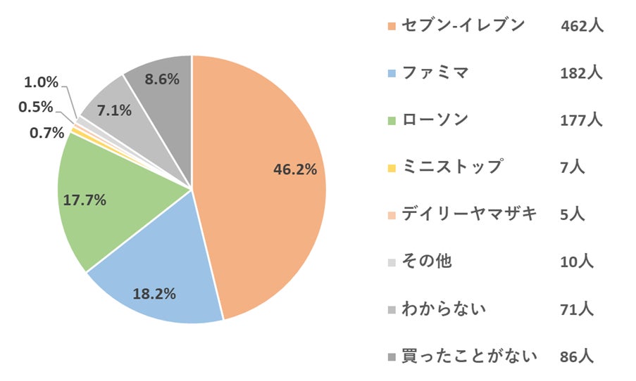「最もどのコンビニで買うことが多いですか?」という質問については、「セブン-イレブン」が46.2%、「ファミマ」が18.2%、「ローソン」が17.7%という順になり、ホットスナックは「セブン-イレブン」で購入している人が最も多いことが分かりました。