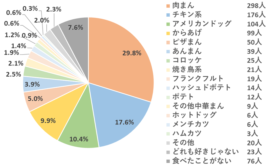 「どのホットスナックが1番好きですか?」という質問については、「肉まん」が29.8%、「チキン系」が17.6%、「アメリカンドッグ」が10.4%という順になりました。