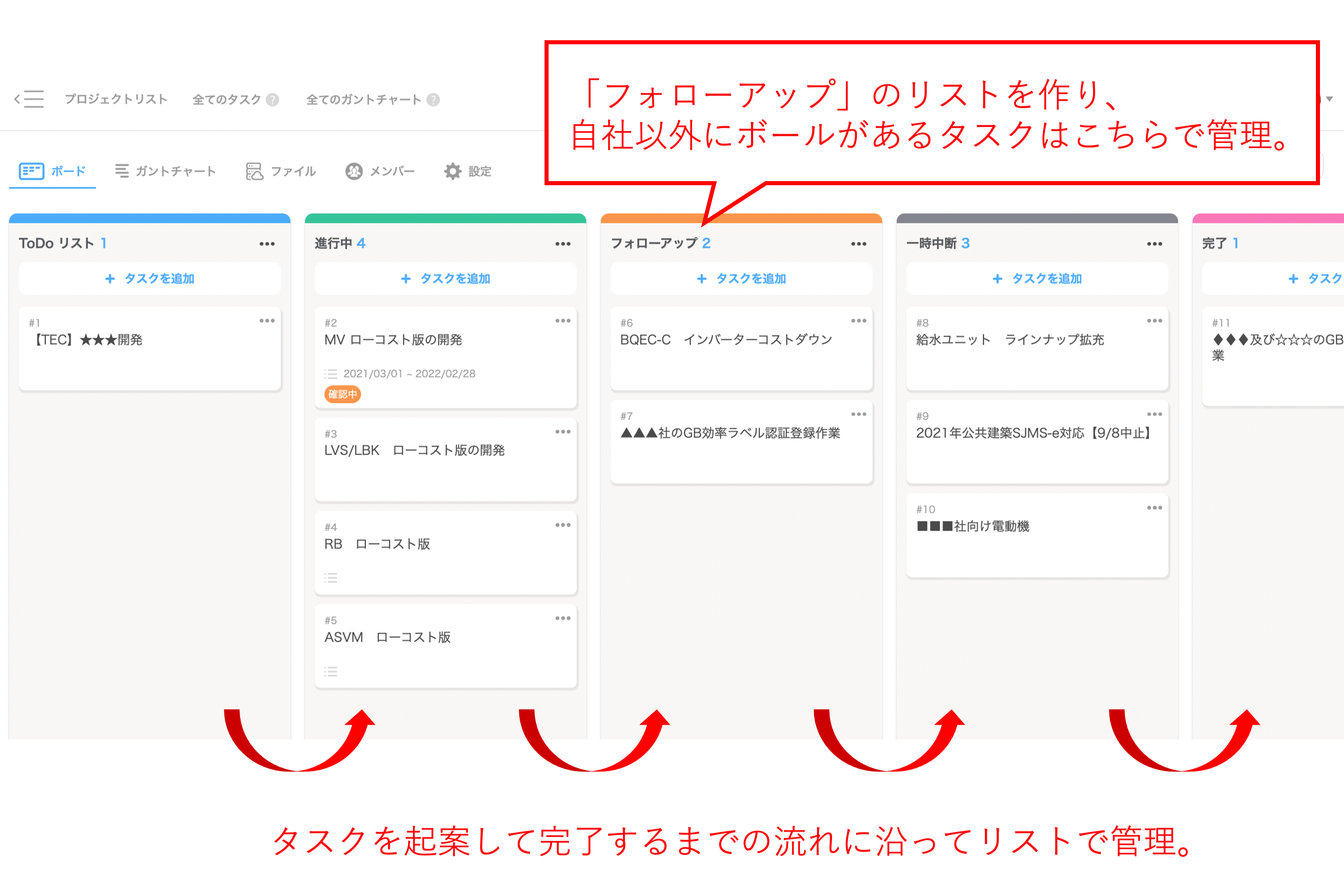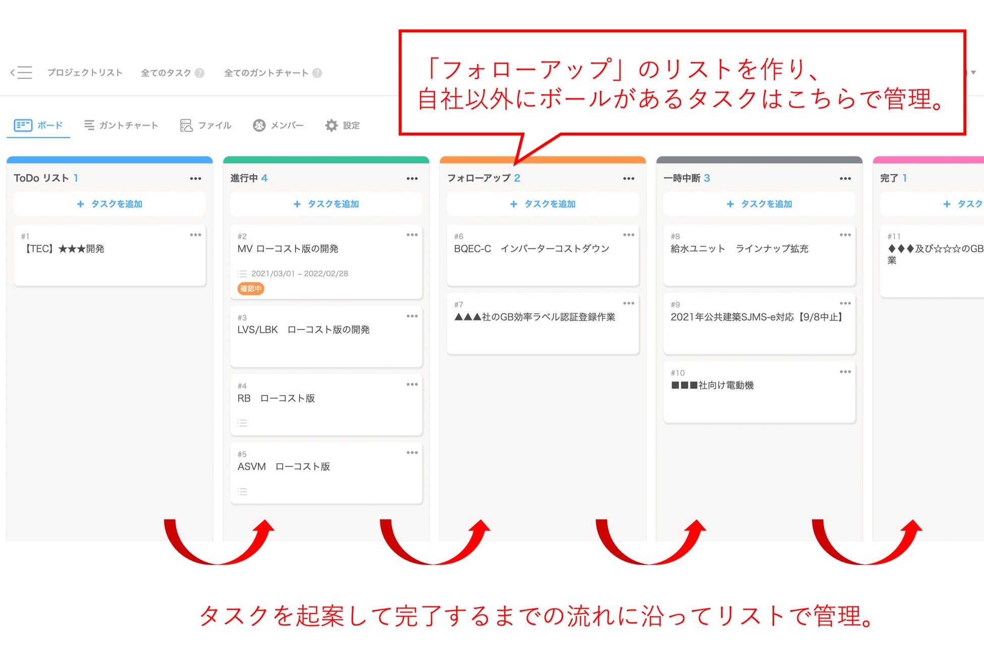 海外拠点間でネットワークが異なるため、共有ドライブがなく、資料のやりとりは基本メールでした。そのためメールを遡って資料を探す手間があったのですが、Jooto上では一覧化されており、すぐに見つかるので便利 ですね。関連会社に依頼中のものなど、自社以外にボールがあるタスクは「フォローアップ」のリストを作成しています。
