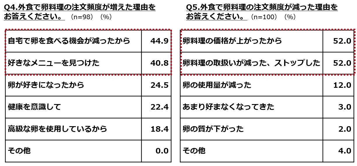 一方、増えた理由では「自宅で食べる機会が減ったから」との回答が最多となり、価格上昇や取扱休止で「卵」の購入・摂食機会が減った影響により、外食で「卵料理」を食べることがより特別感を増し価値ある体験に繋がっている傾向が自由回答からも伺えました。