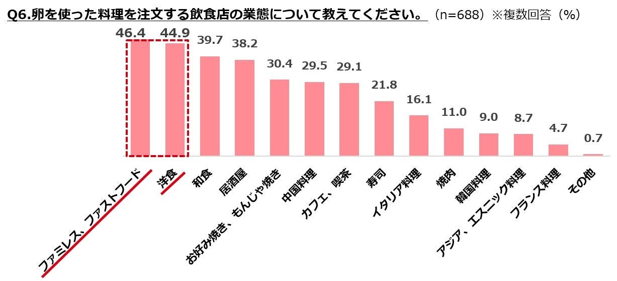 ・卵料理を注文する飲食店は、「ファミレス、ファストフード」が1位、僅差で2位は「洋食」。