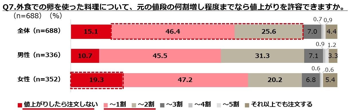 ・値上げの許容範囲は「~1割」が46%、「~2割」が26%。「注文しない」は女性の方が1割程度高い。男性の方がやや許容範囲は広めの傾向。