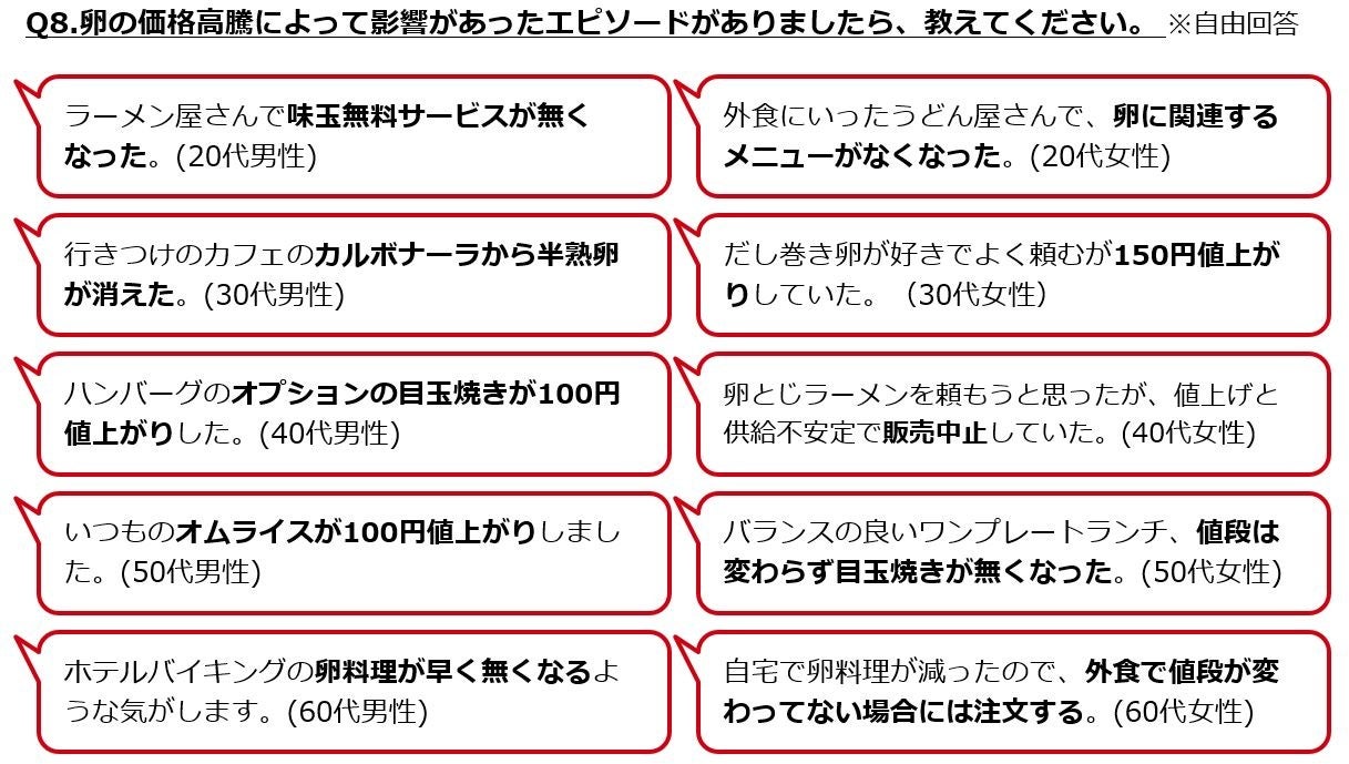 調査では9割と圧倒的な支持を得た「卵料理」。一部の飲食店では卵の供給不足から提供を休止したとの発表がありましたが、消費者の外食における注文頻度については「変わらない」と回答した方が8割でした。ただ、残りの2割の方からは、値上げの影響がうかがえており、「卵料理」の注文頻度が減った理由では「価格上昇」と「取扱休止」と日々の暮らしに影響が出ている様子がうかがえました。