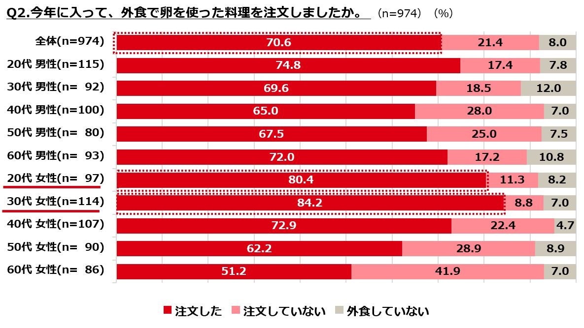 ・今年に入って外食で卵料理を注文した人は7割で、20~30代女性が8割超と高め。
