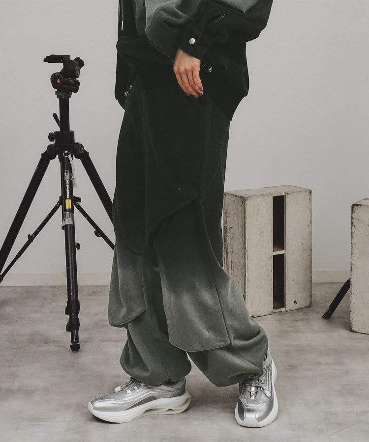 レイヤードパーカーとセットアップでもお使いいただけるスウェットパンツ。腰回りをスッキリさせ、裾に向かって大きくボリュームがあり、「たまり」ができるシルエットがポイントです。パーカー同様、異なる加工を施した2色での展開。タウンユースできるスウェットパンツに仕上がりました。