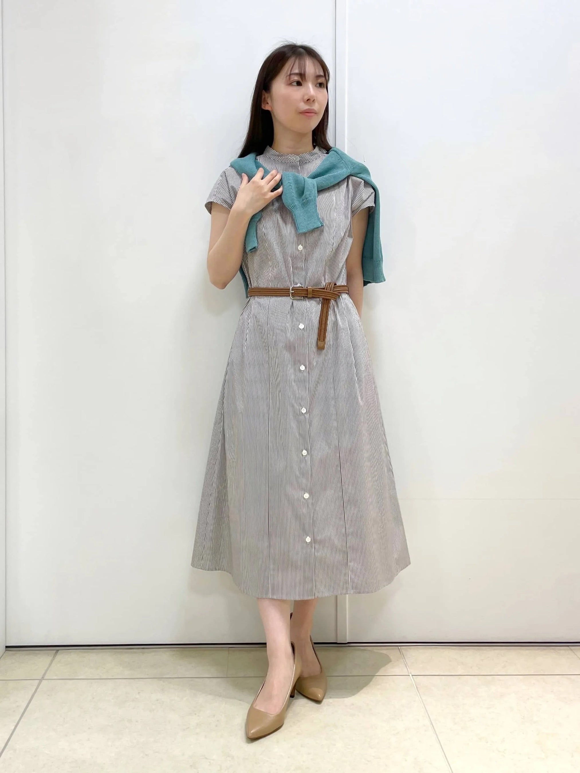 ブラウンのロンドンストライプが大人可愛い、シャツワンピースをメインにしたカジュアルスタイル。