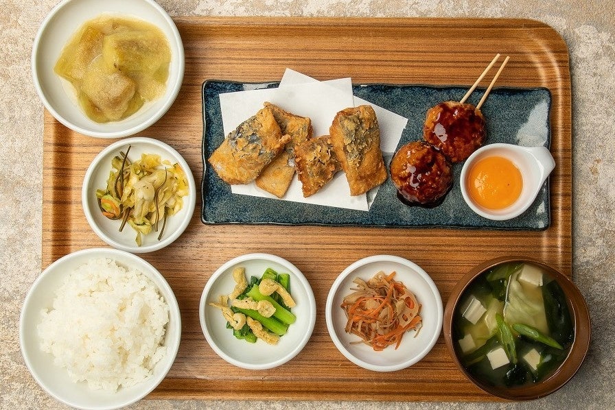 甘辛のタレをまとい軟骨の食感がアクセントになった鶏つくねはそのままの味わいはもちろん、黄身をからめて味変も楽しめます。生醤油の風味豊かな鯖の竜田揚げとメインが二種類の贅沢定食。