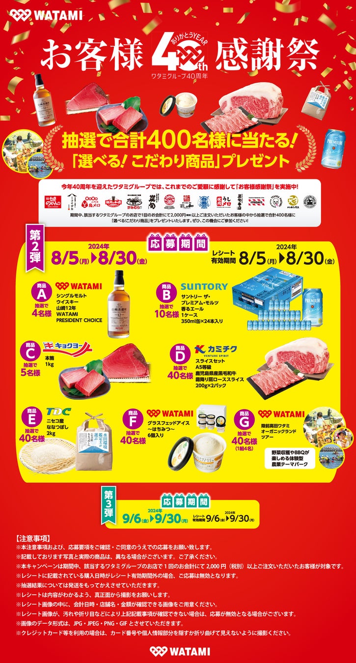 ワタミ株式会社(本社:東京都大田区、以下ワタミ)は、今年で創業40周年を迎えました。40周年を記念して、ワタミの外食店舗では、日頃よりご愛顧いただいているお客様に感謝の気持ちを込めて、「お客様40周年感謝祭」を実施しております。第一弾は、6月3日(月)~6月28日(金)の期間で行いました。今回は第二弾として8月5日(月)~8月30日(金)で外食店舗で1回のお会計につき、2,000円以上(税別)ご利用いただいたお客様を対象に「選べる!こだわり商品」をプレゼントする応募キャンペーンを実施します。ぜひ、この特別な機会にお食事をお楽しみいただき、豪華なプレゼントを手に入れるチャンスをお試しください。また、「お客様40周年感謝祭」第三弾も予定をしておりますので、ご期待ください。