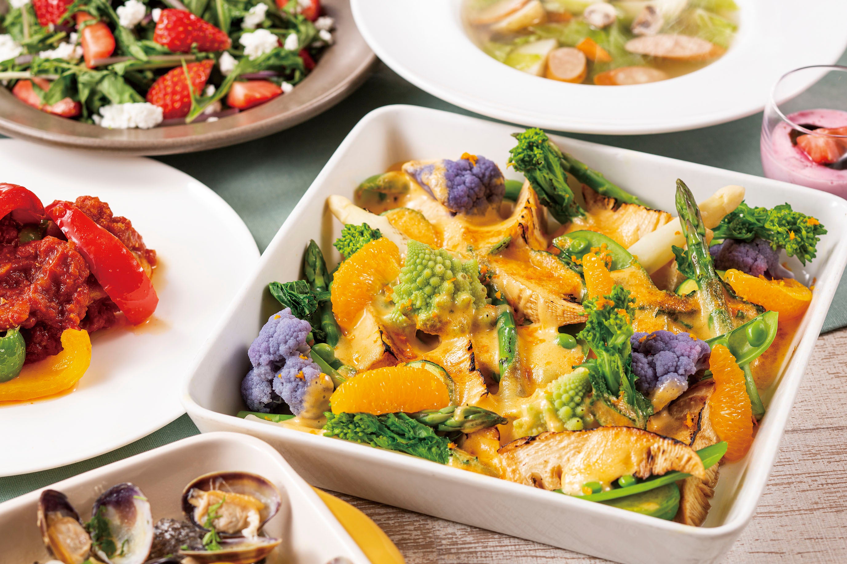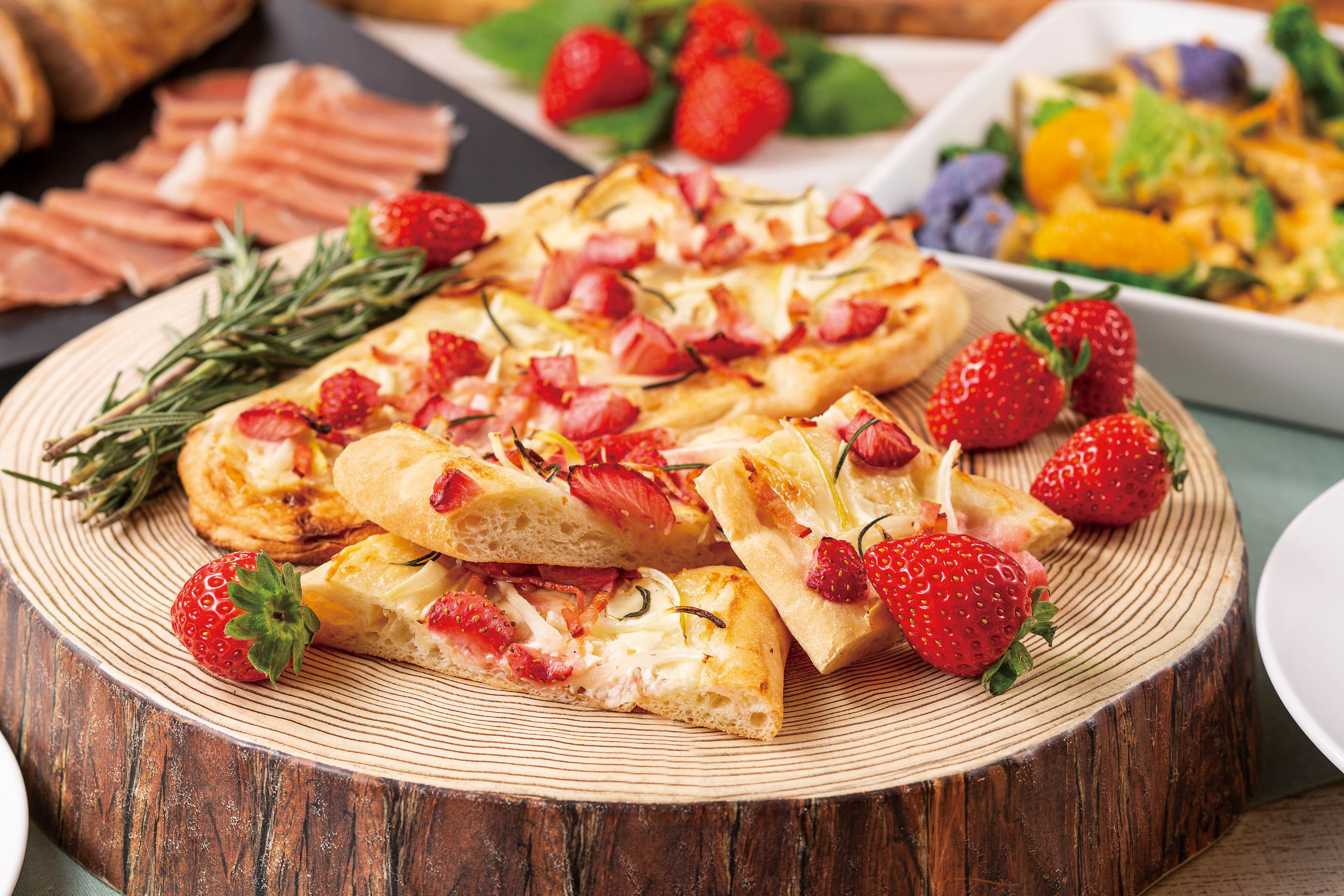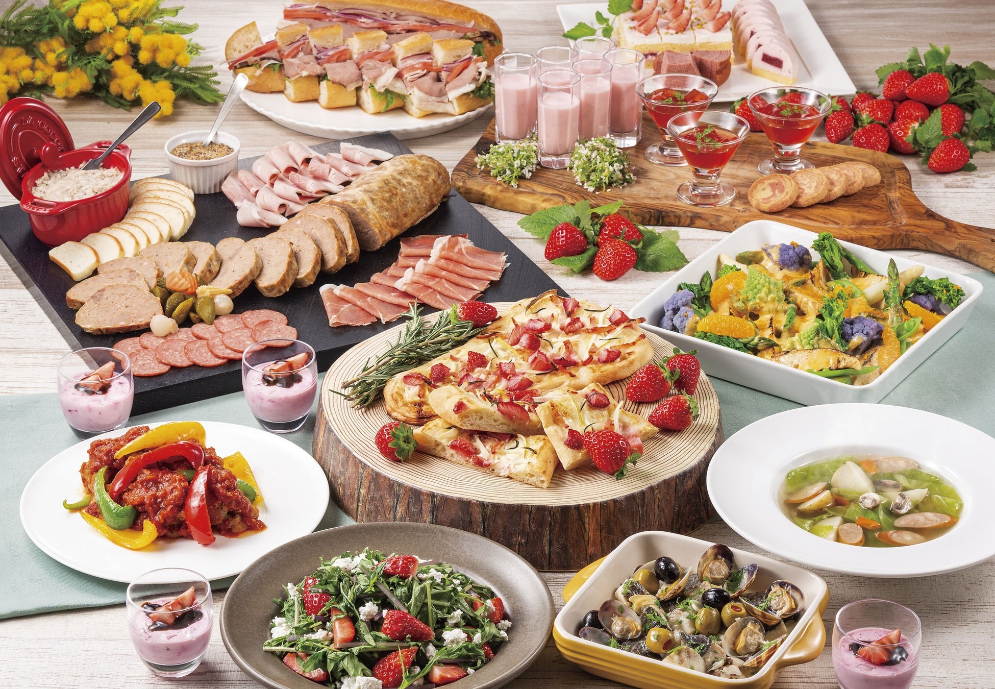 苺のタルトフランベ ローズマリー風味、春野菜とアスパラガスグラタン オランデーズソース、千葉県産スズキとアサリのマリニエール レモン風味、オムライスコーナー、苺と水菜のサラダ カッテージチーズ、苺のババロア、苺とヨーグルトのスムージー エルダーフラワーの香り、苺のショートケーキ、苺のバームクーヘン、苺のレアチーズケーキなど 40種類以上