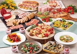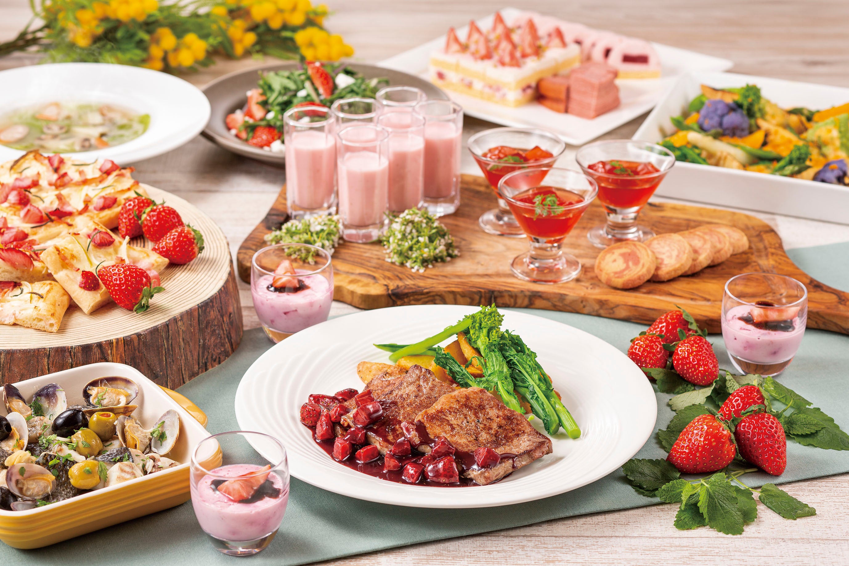 40種以上を取り揃えたブッフェスタイルのメニューにも、「苺と水菜のサラダ」や「苺のタルトフランベ」など、苺を使ったシェフのアレンジ料理を多数ご用意。中でも、実演コーナーでランチタイムにご提供するサーロインステーキとディナータイムにご提供するローストビーフには、シェフこだわりの“赤ワイン苺ソース”をかけてお召し上がりいただきます。お魚料理は、フランスのブルターニュ地方で親しまれている漁師料理“マリニエール”に仕立てたスズキをご用意しました。酒蒸しにした千葉県産のスズキとアサリにハーブとレモンをきかせた、春らしく爽やかな香りが楽しめる一品です。新鮮な苺とフレンチ、春を彩るお料理の数々を存分にご堪能ください。