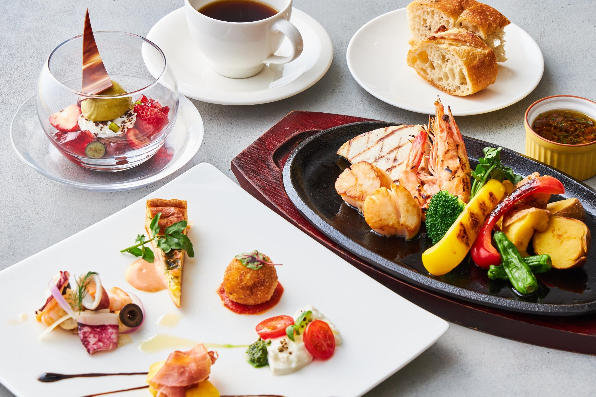 前菜では一口サイズの盛り合わせをお楽しみください。2種から選べるメインディッシュの1つ目は「カジキ鮪・海老・帆立貝のグリルプレート」。素材の良さを最大限引き出し、香ばしくグリルした魚介と季節野菜を熱々のプレートでご提供いたします。香味野菜をふんだんに使用し、食感や香りを楽しみながらも、さっぱりとした日本人好みの味にアレンジしたソースでお召し上がりください。2つ目は「漁師風 魚介と季節野菜のコトリヤード」。フランス・ブルターニュ地方の郷土料理で蒸し煮にした魚介と野菜の絶妙な味わいを楽しめます。締めくくりのデザートは、大人が楽しめるパフェをご用意いたします。ショコラとベリーの最高の組み合わせを濃厚なピスタチオアイスとともにご堪能ください。