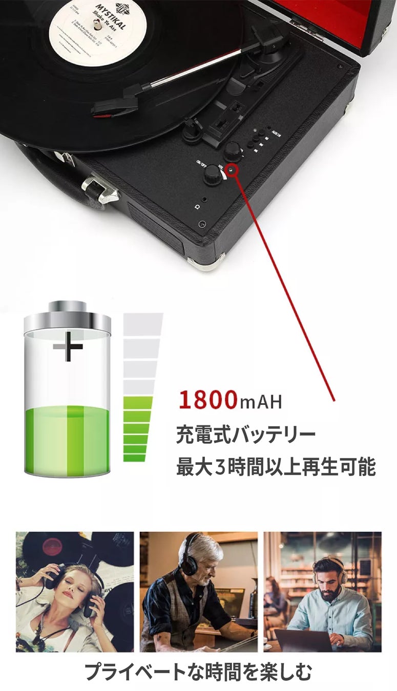充電式バッテリーで、最大約3時間以上再生可能です。