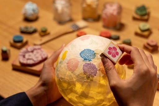 夜の庭園散策に向けて、和紙を使ってオリジナルの提灯を作成する体験ができます。作成した提灯には、消しゴムはんこ作家の津久井智子氏による伊豆の植物をモチーフにした作品を用いて、彩り豊かにデザインできます。