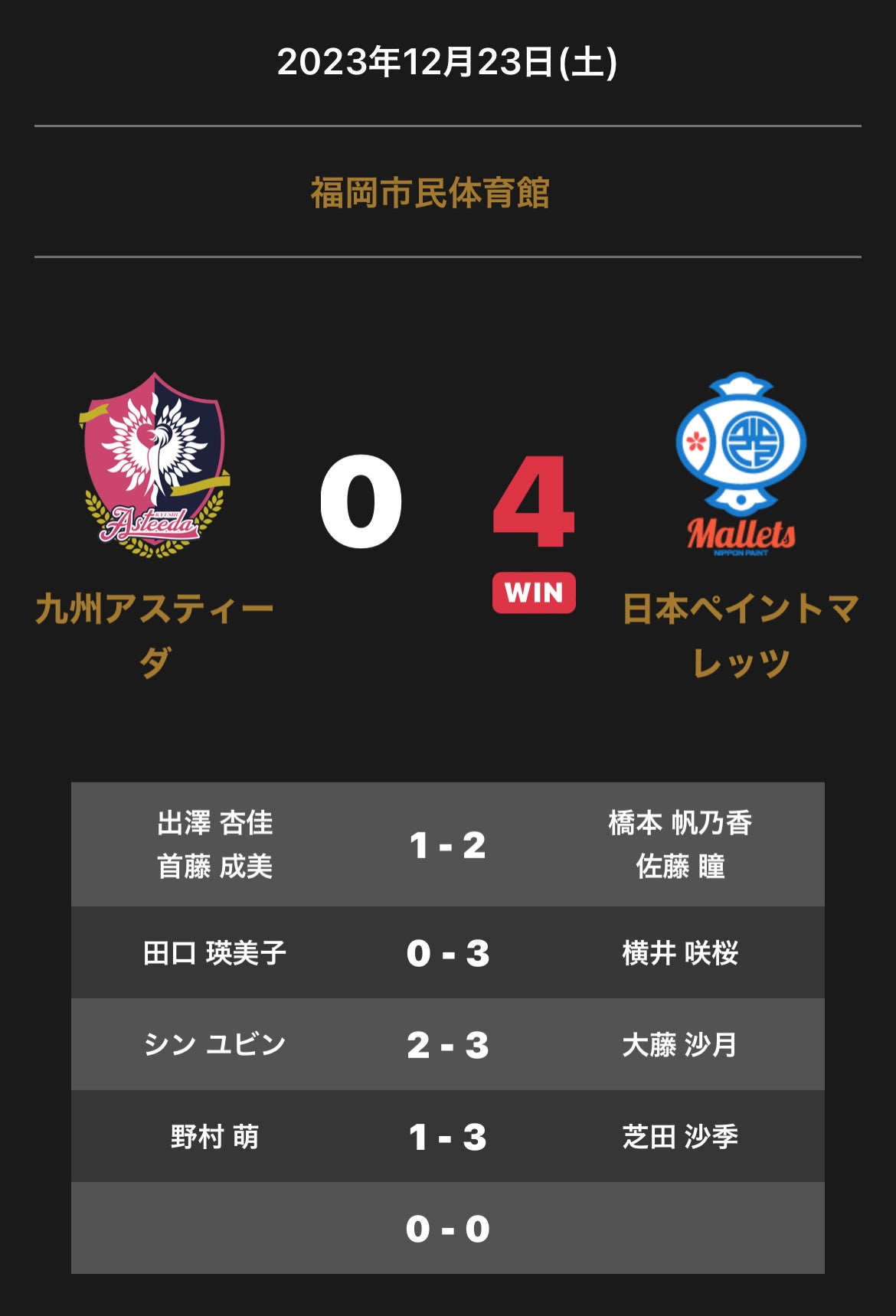 ノジマTリーグ 2023-2024シーズン 公式戦 12月23日開催 九州アスティーダ vs 日本ペイントマレッツ 試合結果