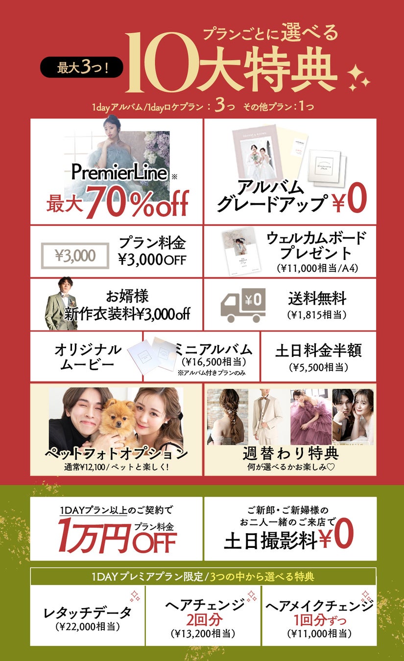 「予算も気になるけれど、とことんこだわりたい」という方へ朗報です。このフェアでは、最大90,000円相当の豪華特典をご用意。特に「1dayアルバムプラン以上」の即日ご契約で、プラン料金から10,000円OFFとなる特典や、お二人揃ってのご来店で土日祝日撮影料金(11,000円相当)が無料になる特典など、大変お得な内容です。この機会に、理想のウェディングフォトを賢くお得に叶えましょう。