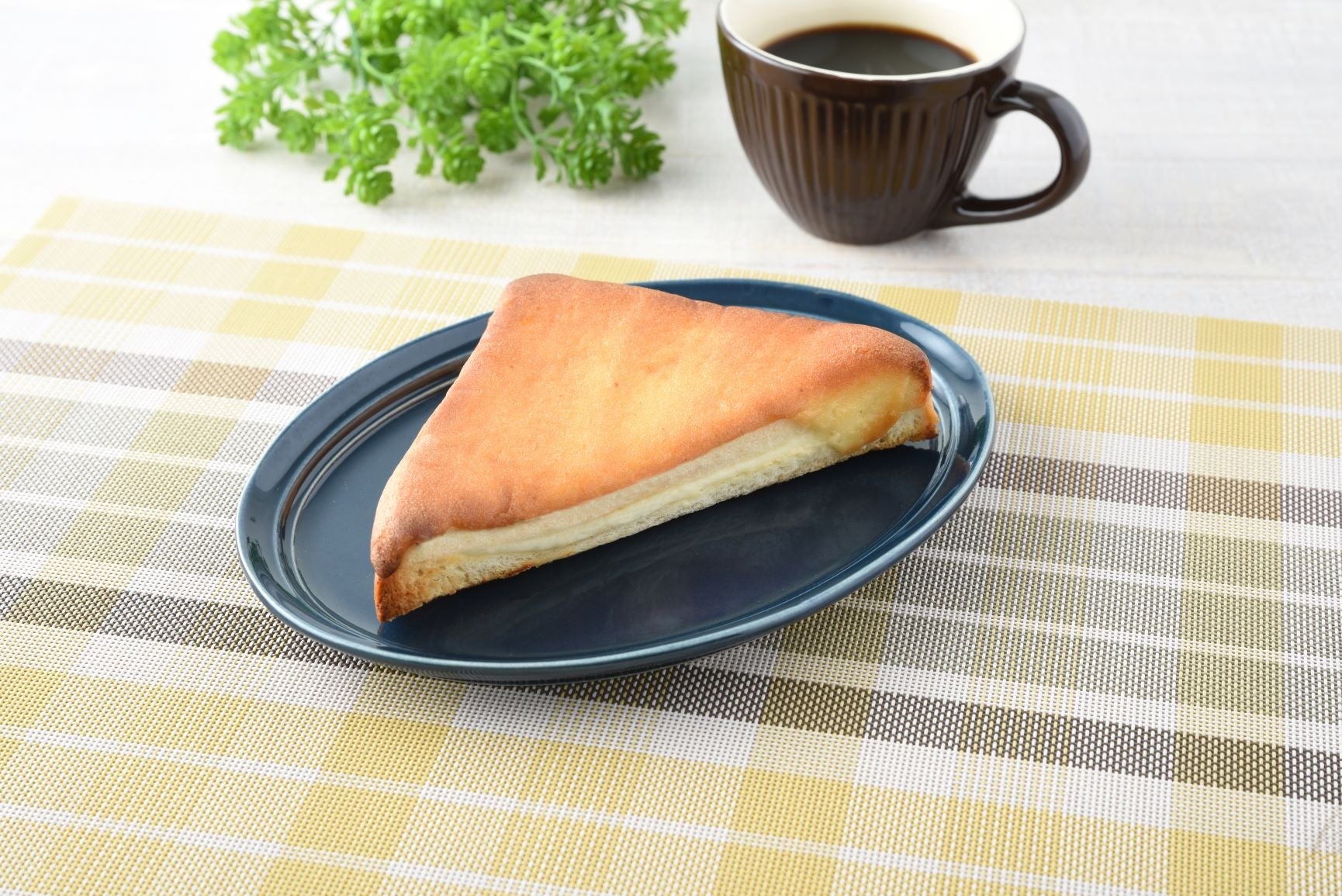 【内容】大分県で人気の三角チーズパンを再現し、食パンにチーズフィリングをサンドし、ケーキ生地をかけて焼きあげた菓子パンです。