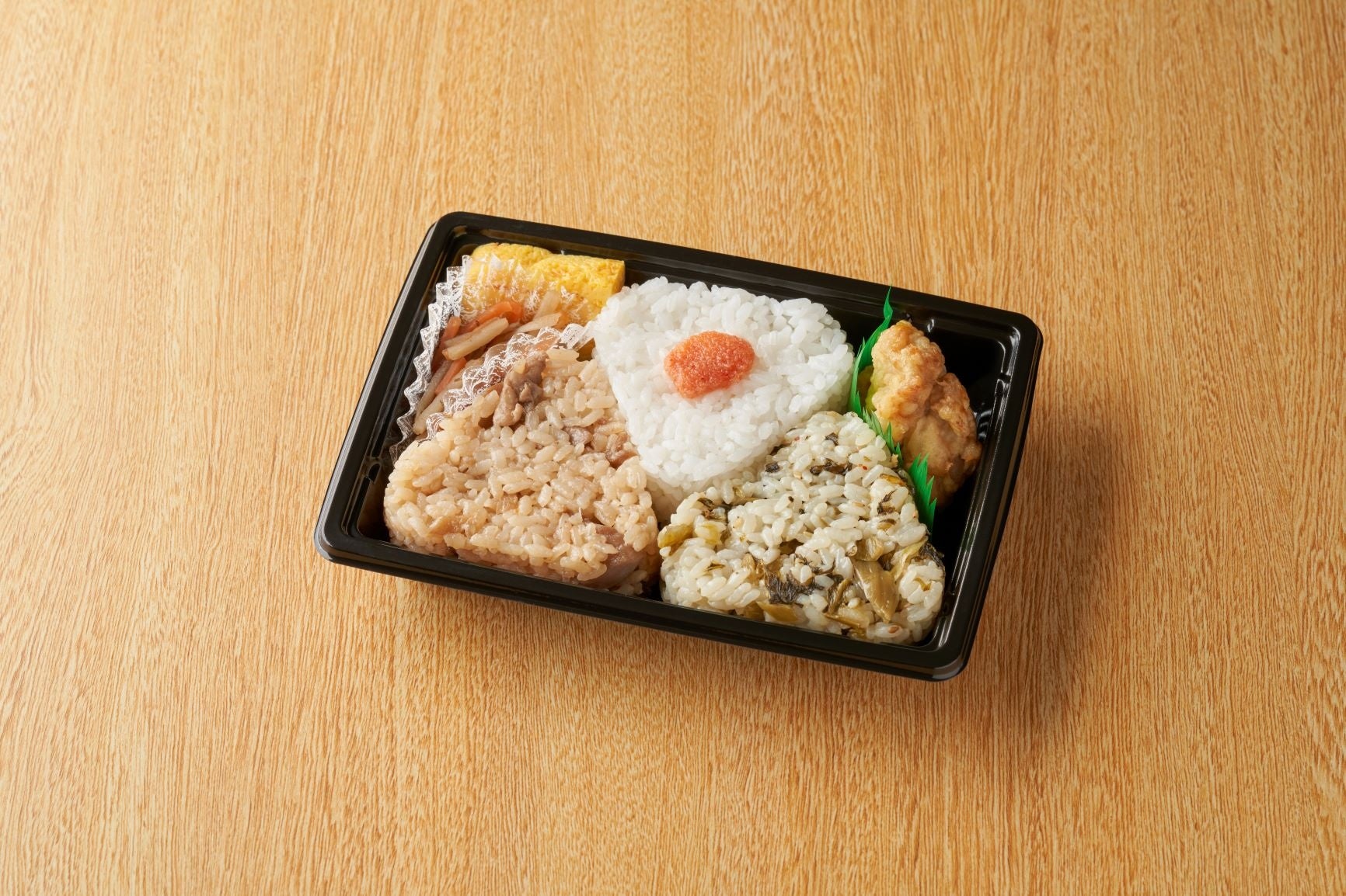 【内容】博多明太子、鶏めし、高菜を使用したおむすびをセットにし、フンドーキン醤油を使用したとり天をトッピングしました。